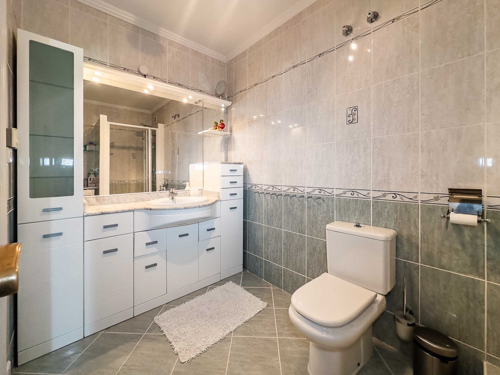 Upper floor: features 2 bedrooms with fitted wardrobes and double beds. The master bedroom with ceiling to floor glass door is leading to a 11 m2 large south-west facing covered terrace with panoramic views. Further these is a small room with bunk bed, and a spacious bathroom with shower & heating floor.