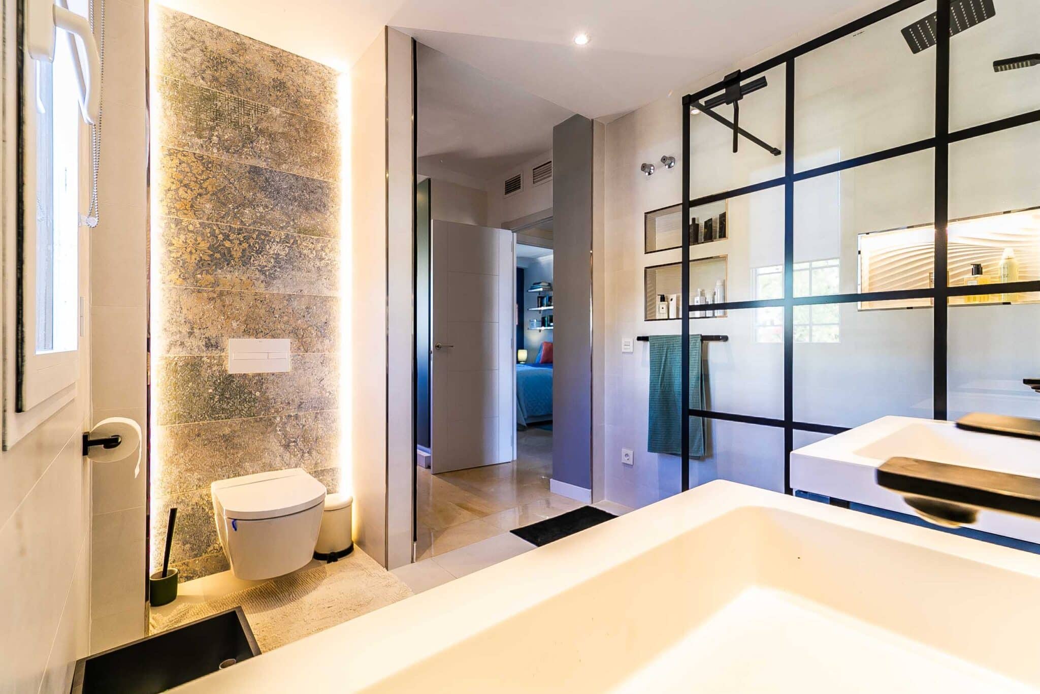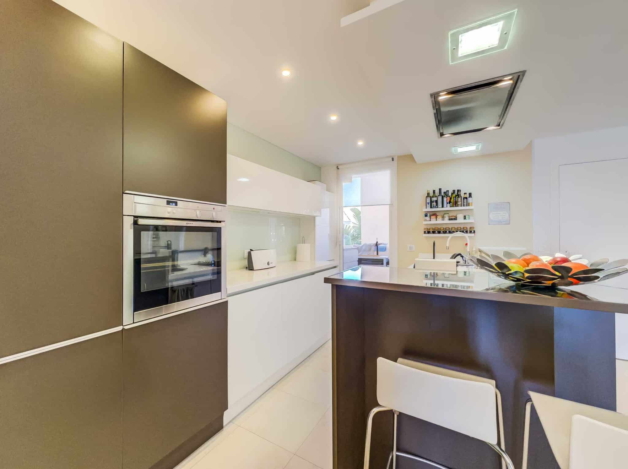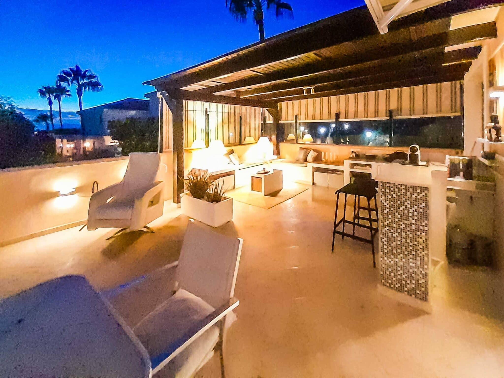 This holiday home consists of two large bedrooms with fitted wardrobes, each with 1 double bed, two modern bathrooms with shower, one of them “en-suite”, a spacious and bright living/dining room with glass ceiling doors. floor opening directly onto the terrace, an open plan kitchen fully equipped with all appliances and, best of all, the very spacious and partially covered terrace with plenty of sun and panoramic views over the Mediterranean Sea and the mountains. At night the views are even more impressive.