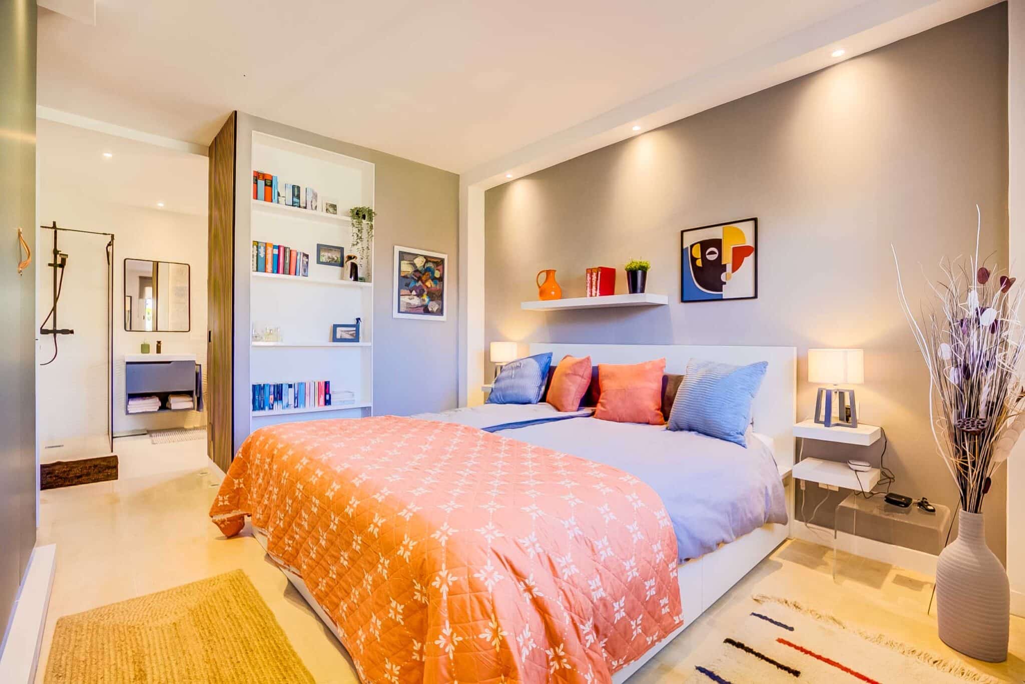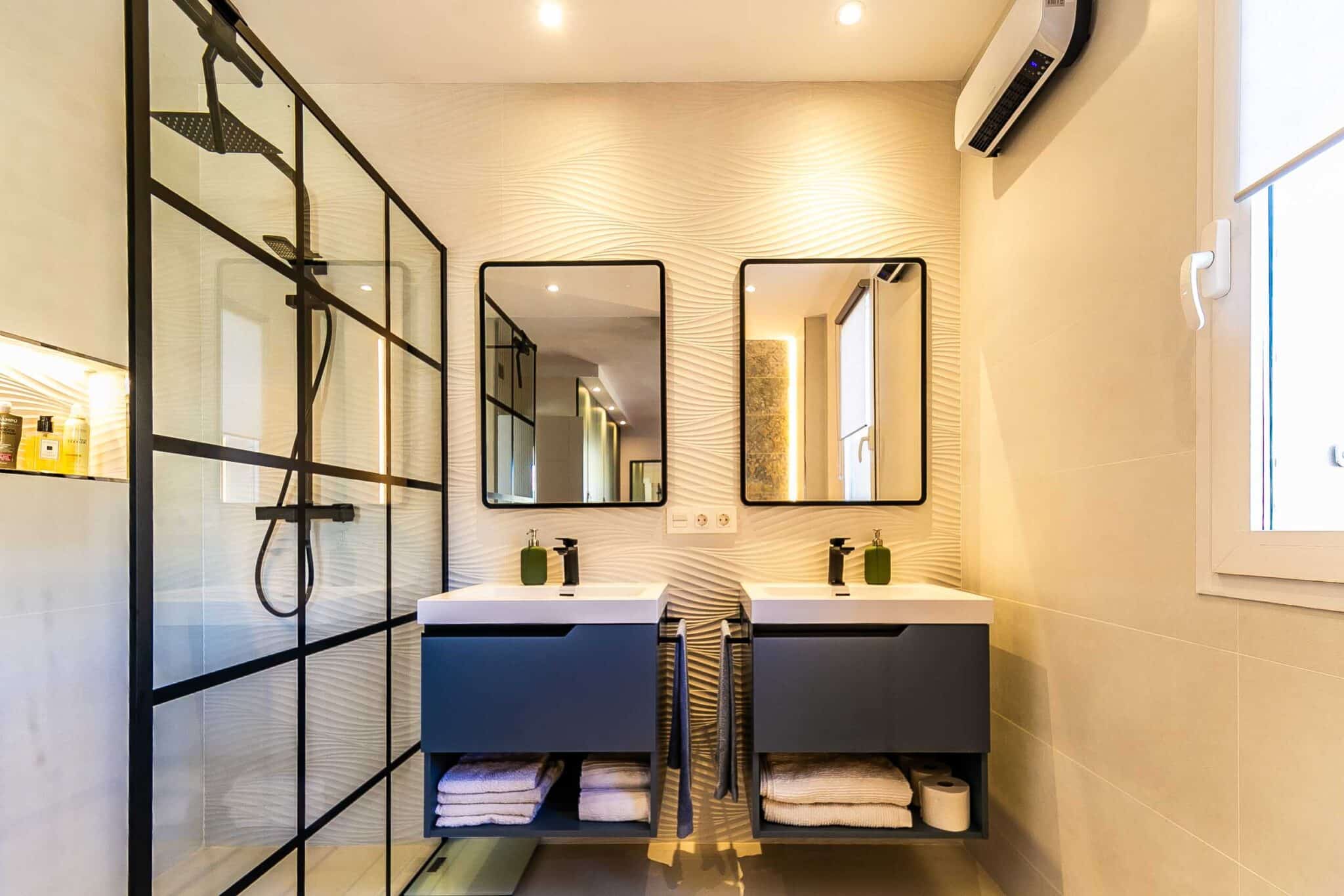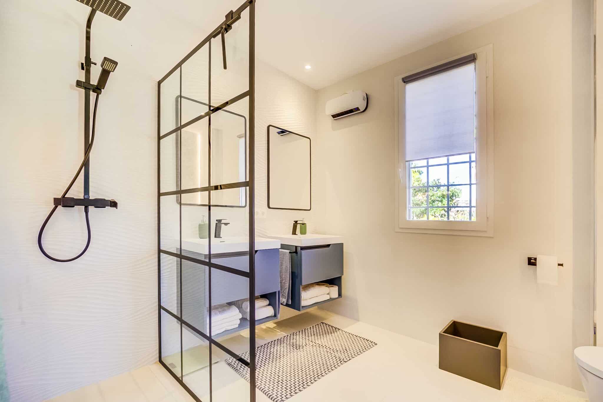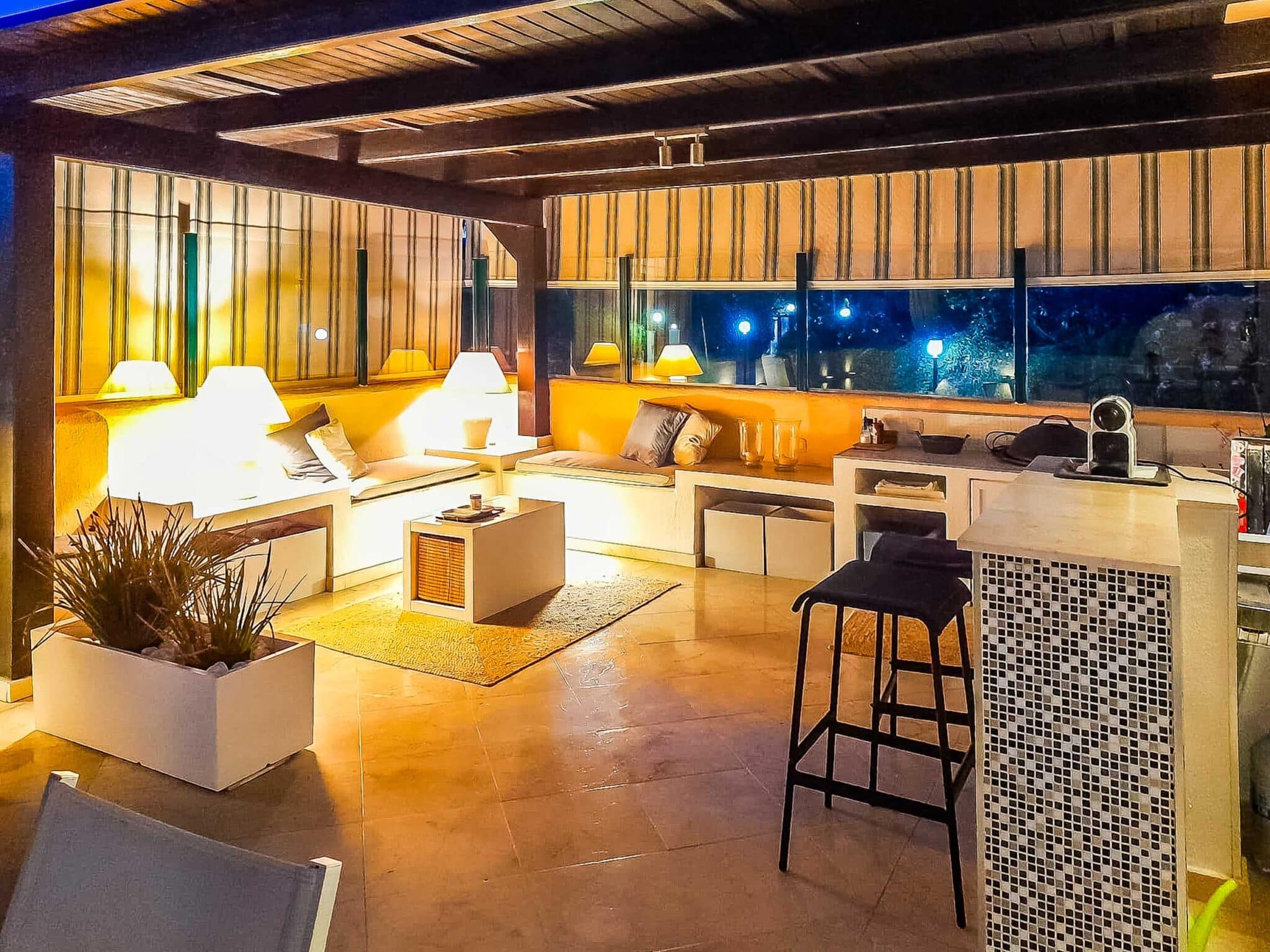 This holiday home consists of two large bedrooms with fitted wardrobes, each with 1 double bed, two modern bathrooms with shower, one of them “en-suite”, a spacious and bright living/dining room with glass ceiling doors. floor opening directly onto the terrace, an open plan kitchen fully equipped with all appliances and, best of all, the very spacious and partially covered terrace with plenty of sun and panoramic views over the Mediterranean Sea and the mountains. At night the views are even more impressive.