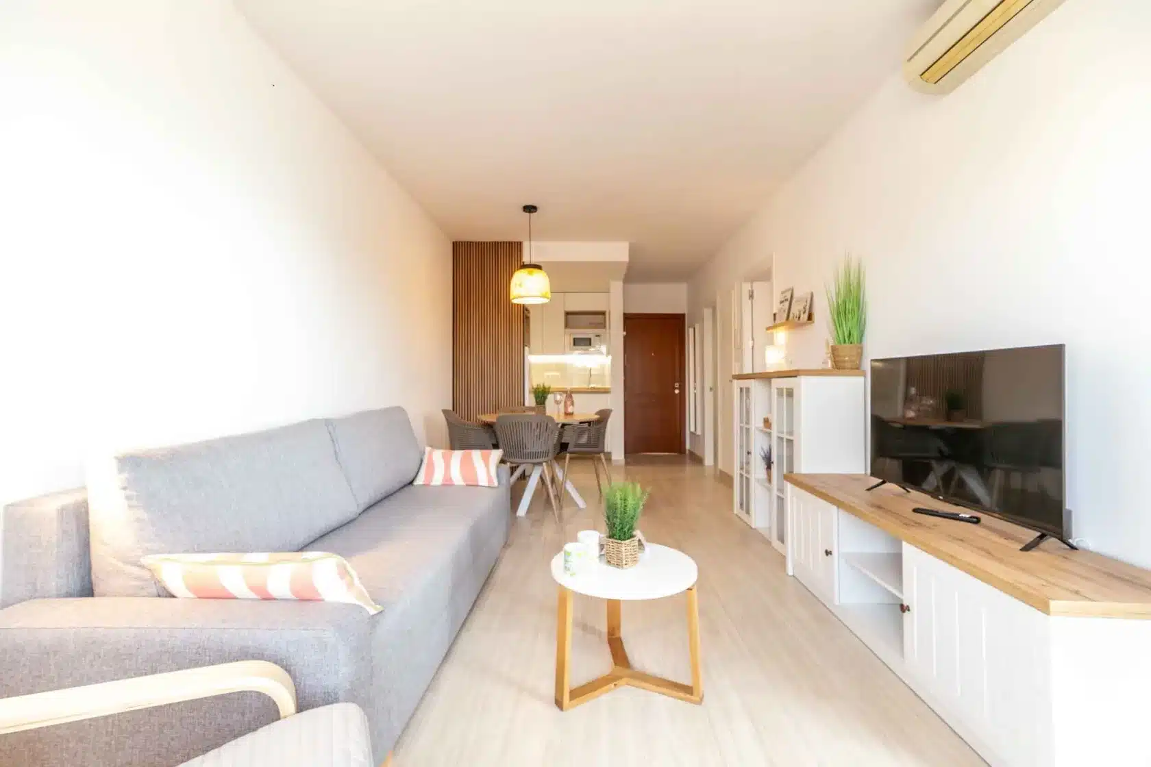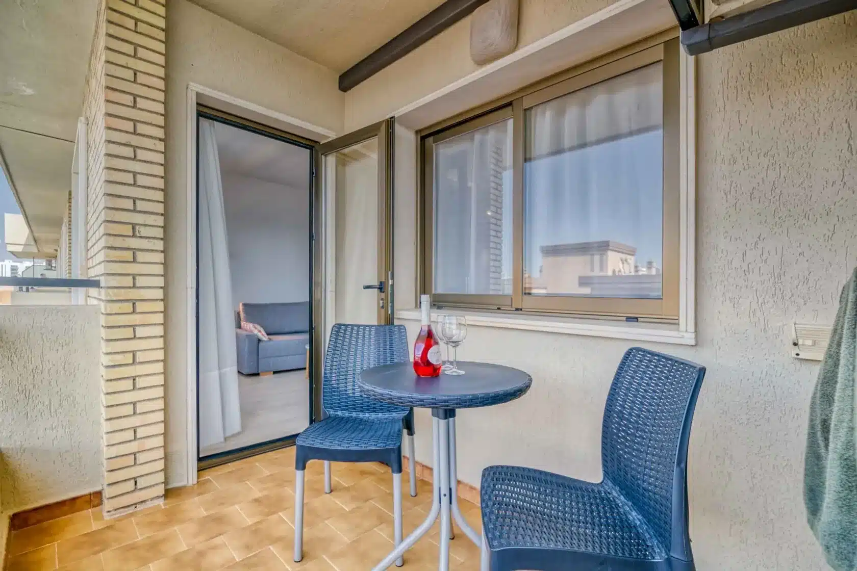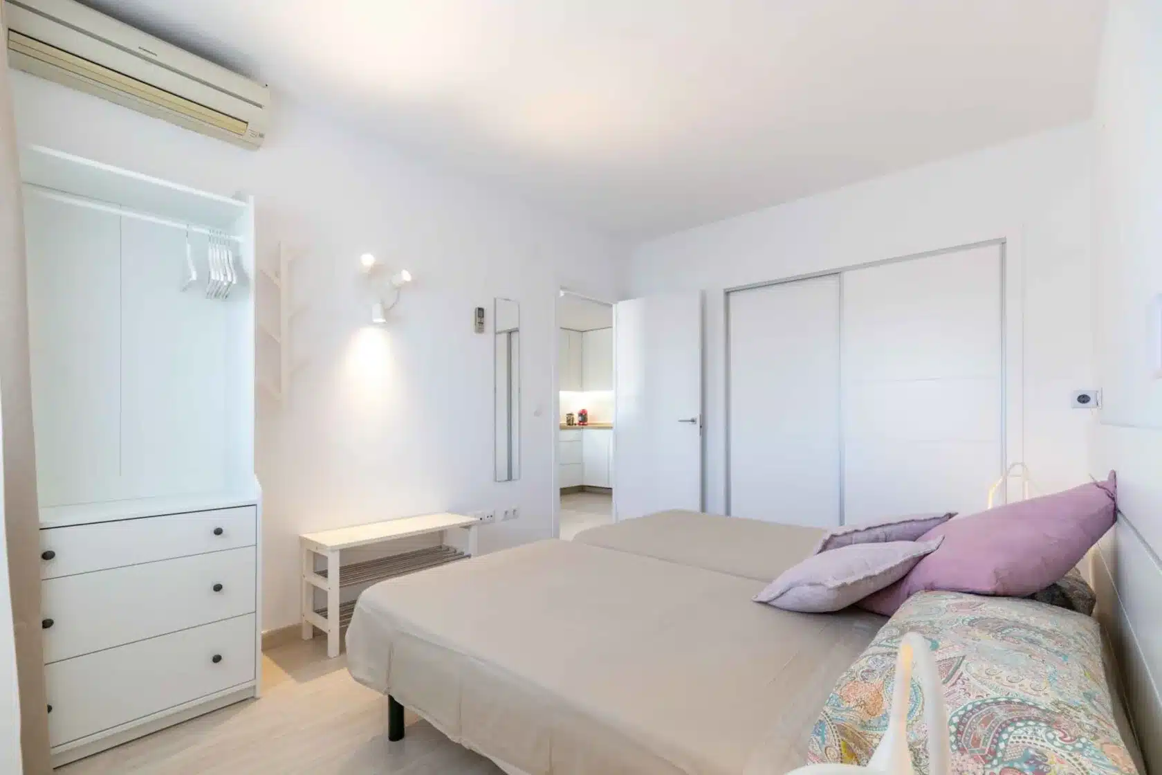 The apartment offers one spacious bedroom with a double bed and a large fitted wardrobe, providing ample storage for all your belongings. The cozy living room is designed for relaxation, completed with a comfortable sofa bed that can accommodate another two guests. Unwind with a good book, watch your favorite shows on the flat-screen TV, or simply gaze at the sea. The fully equipped kitchen has everything you may need during your stay. The contemporary bathroom includes all essential amenities and offers a refreshing space to start or end your day. Lastly, the cozy terrace will allow you to contemplate the Mediterranean Sea or watch the amazing pool while having a refreshing drink.