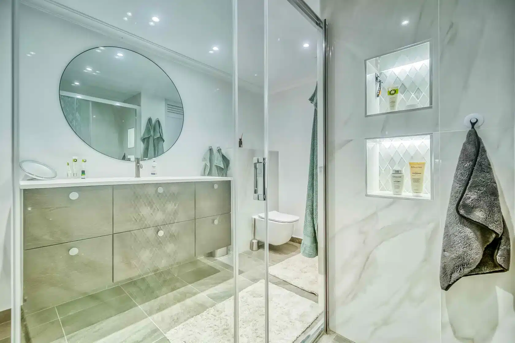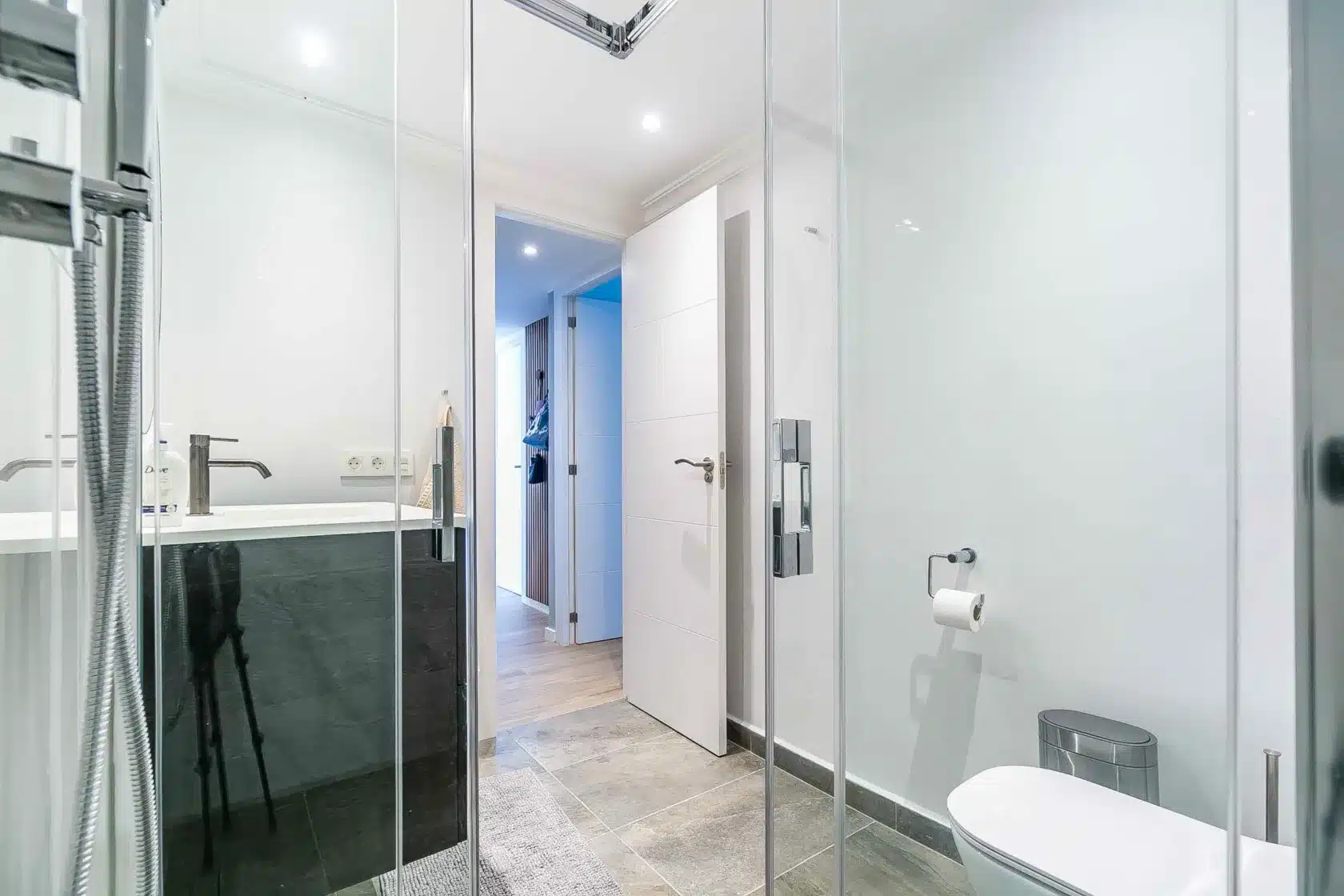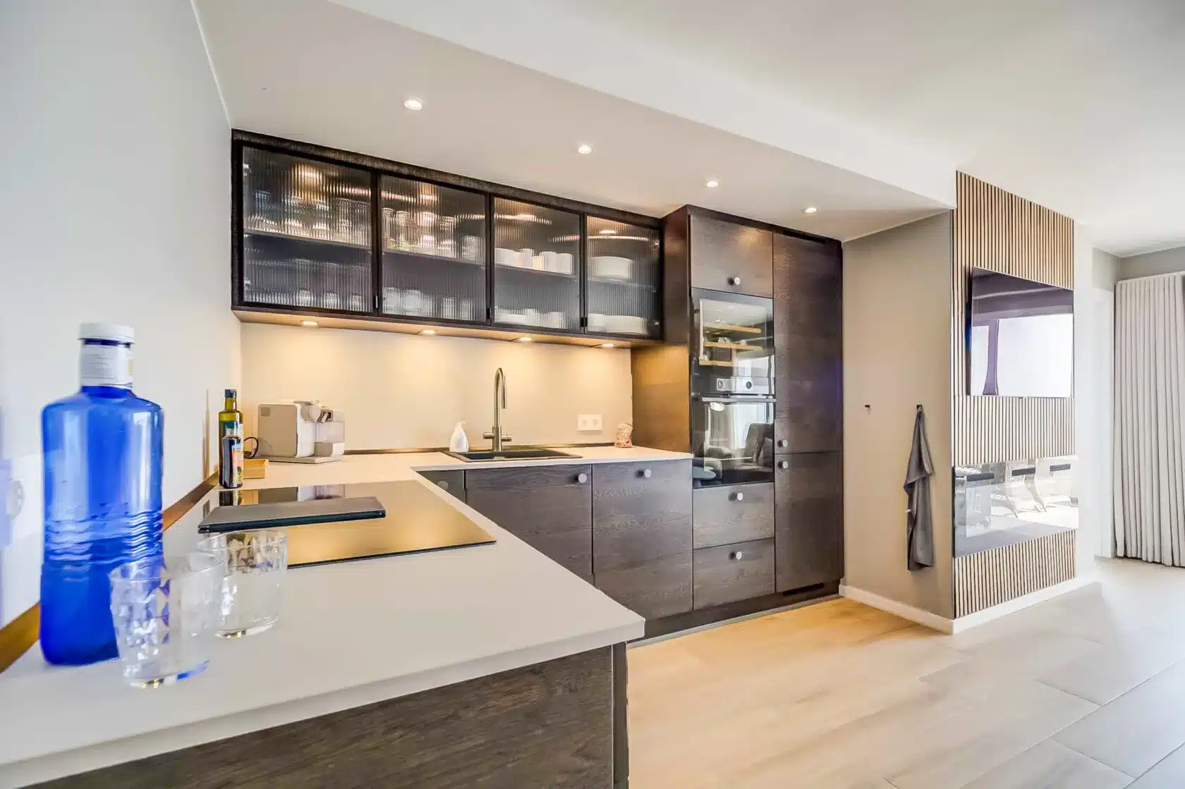 The 94m2 spacious apartment features 2 spacious bedrooms , both with fitted wardrobes. One of them with ceiling to floor glass doors leading to the terrace and stunning Sea views. Each bedroom features a comfortable double bed and storage for your belongings. 2 complete modern bathrooms, both with shower, and one of them “en suite”. A spacious and bright living/dining room, with large glass doors leading to a stunning terrace with panoramic views of the Sea. A fully equipped open kitchen with modern appliances, where you can prepare your meal while enjoying the views, and last but not least a 21 m2 large south-east facing terrace, an ideal spot to enjoy the sun all day long , while relaxing and finding peace as night falls.