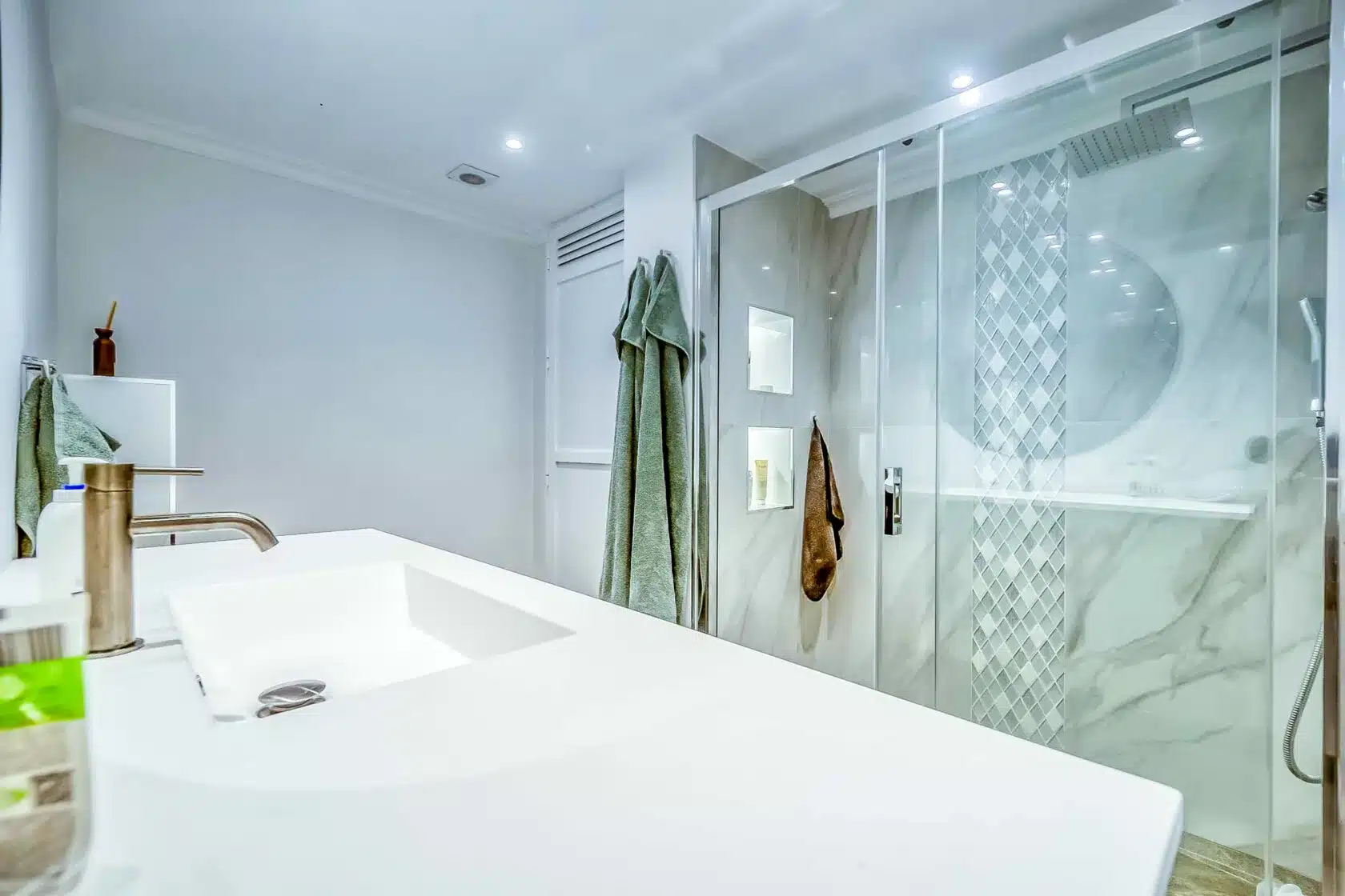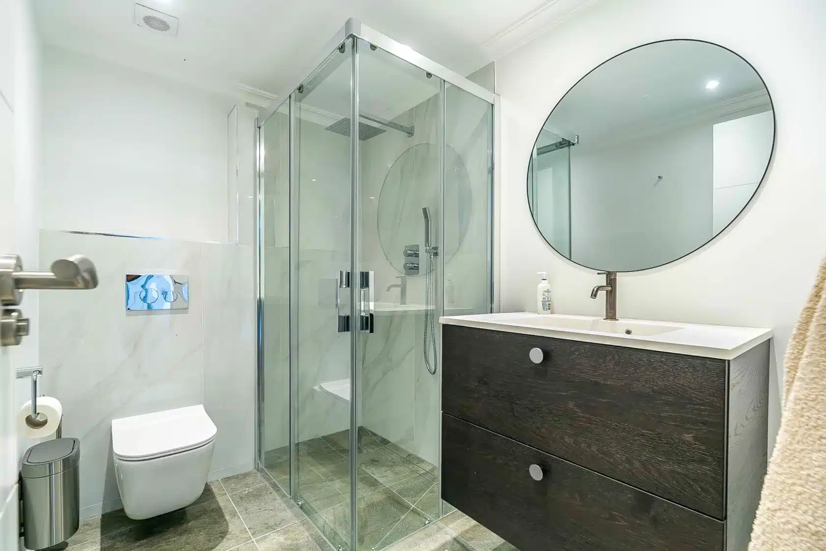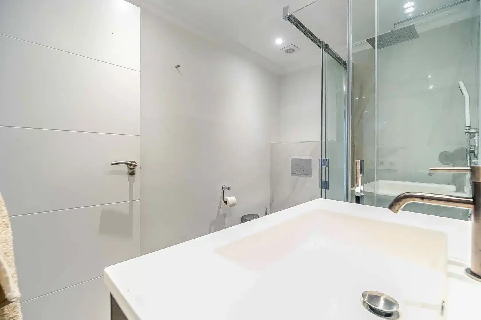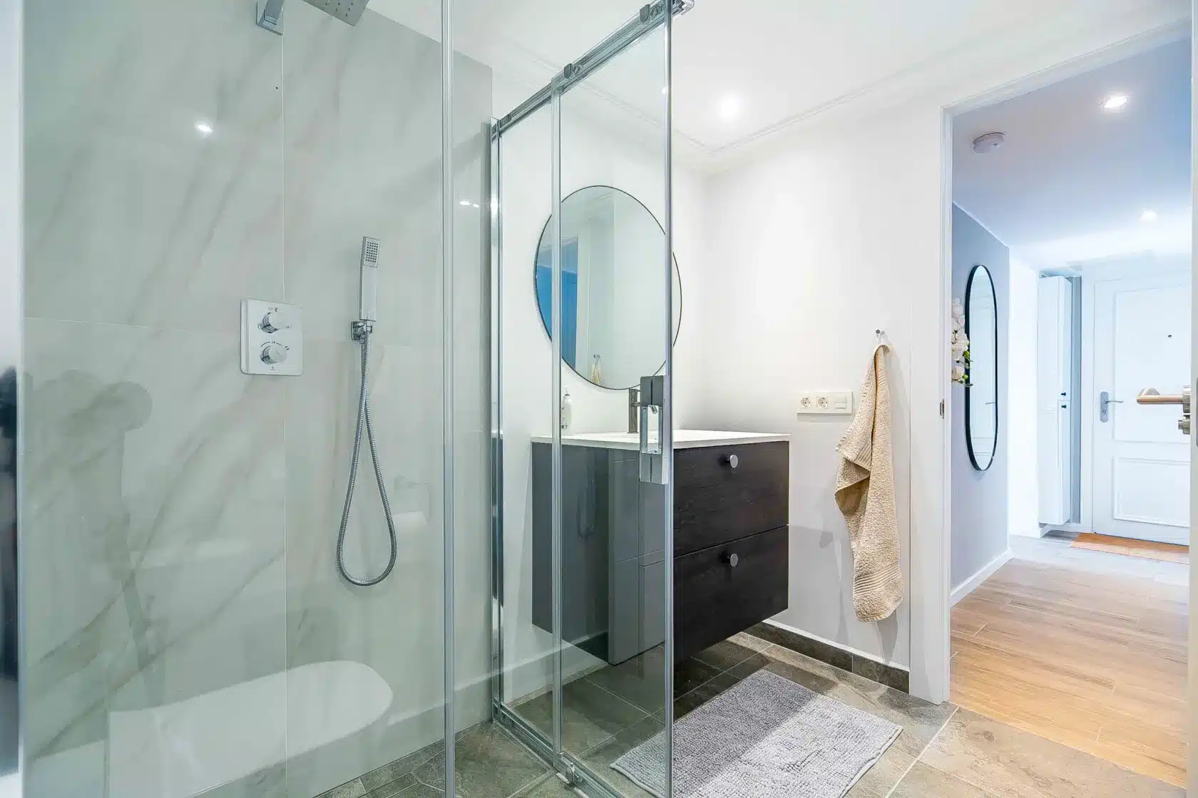 The 94m2 spacious apartment features 2 spacious bedrooms , both with fitted wardrobes. One of them with ceiling to floor glass doors leading to the terrace and stunning Sea views. Each bedroom features a comfortable double bed and storage for your belongings. 2 complete modern bathrooms, both with shower, and one of them “en suite”. A spacious and bright living/dining room, with large glass doors leading to a stunning terrace with panoramic views of the Sea. A fully equipped open kitchen with modern appliances, where you can prepare your meal while enjoying the views, and last but not least a 21 m2 large south-east facing terrace, an ideal spot to enjoy the sun all day long , while relaxing and finding peace as night falls.