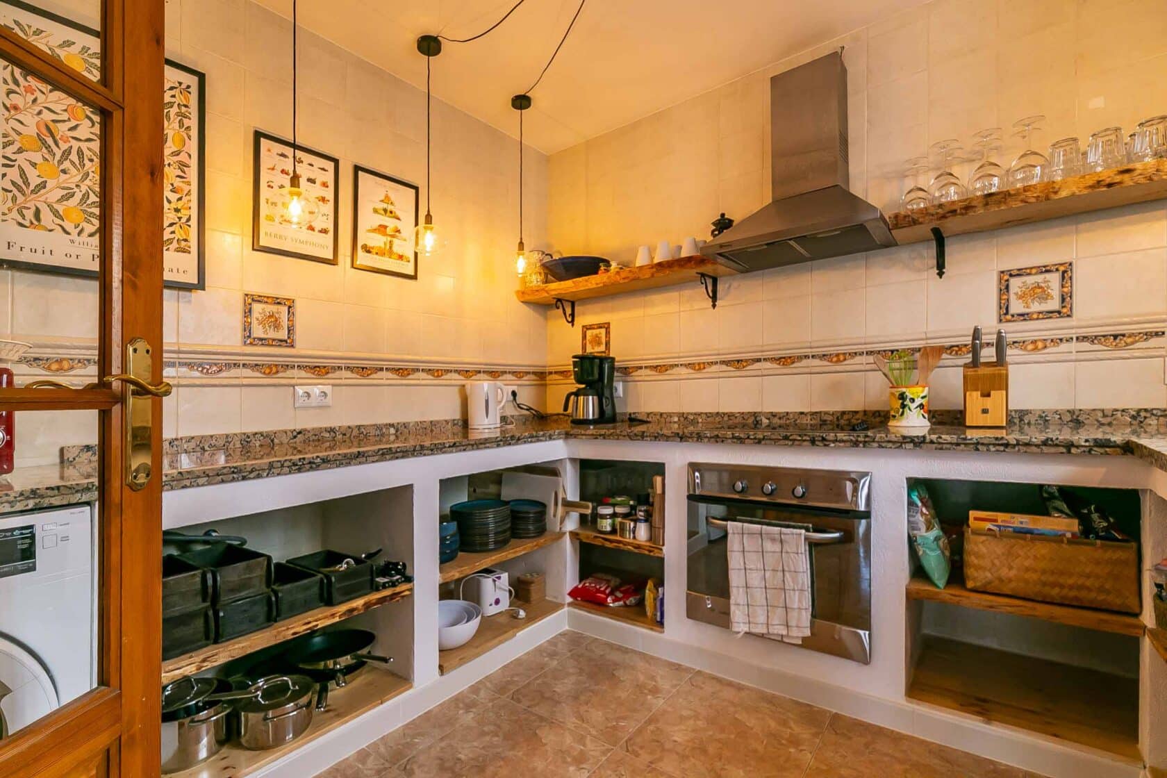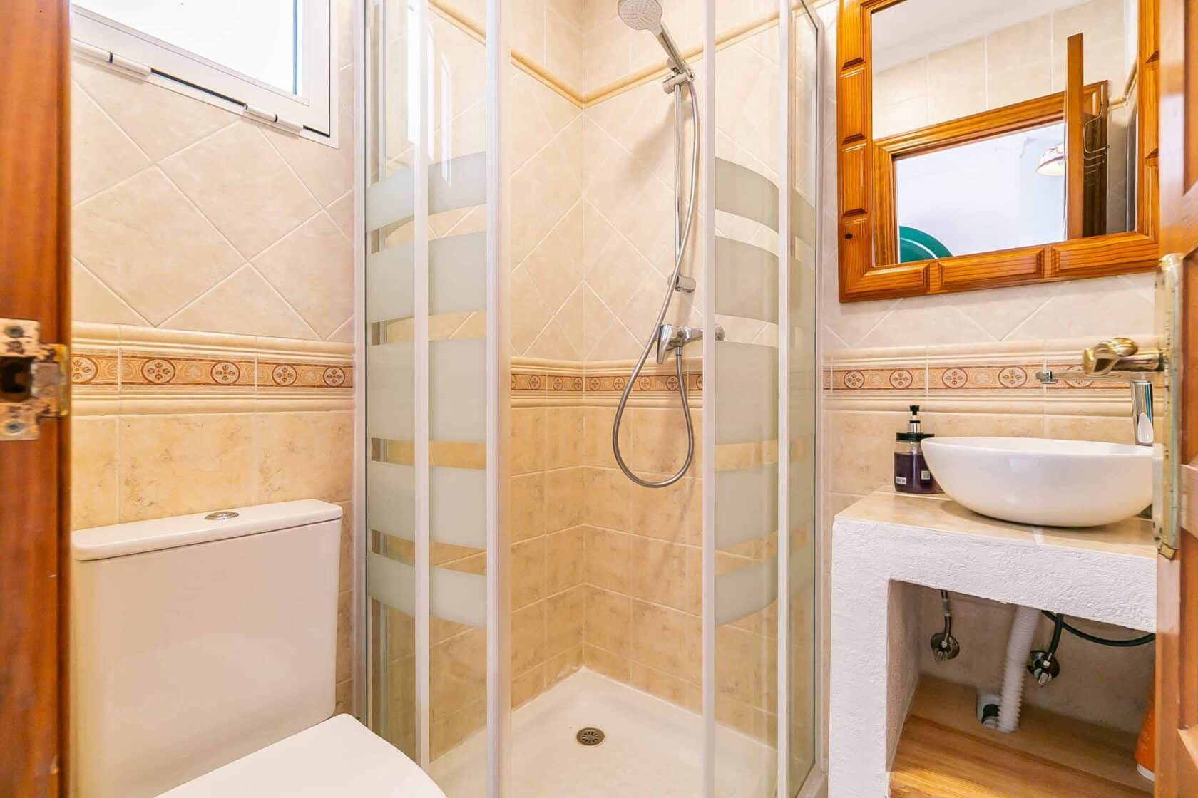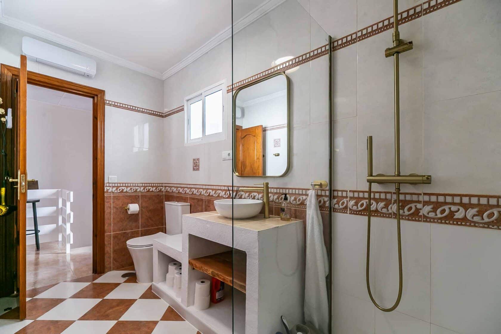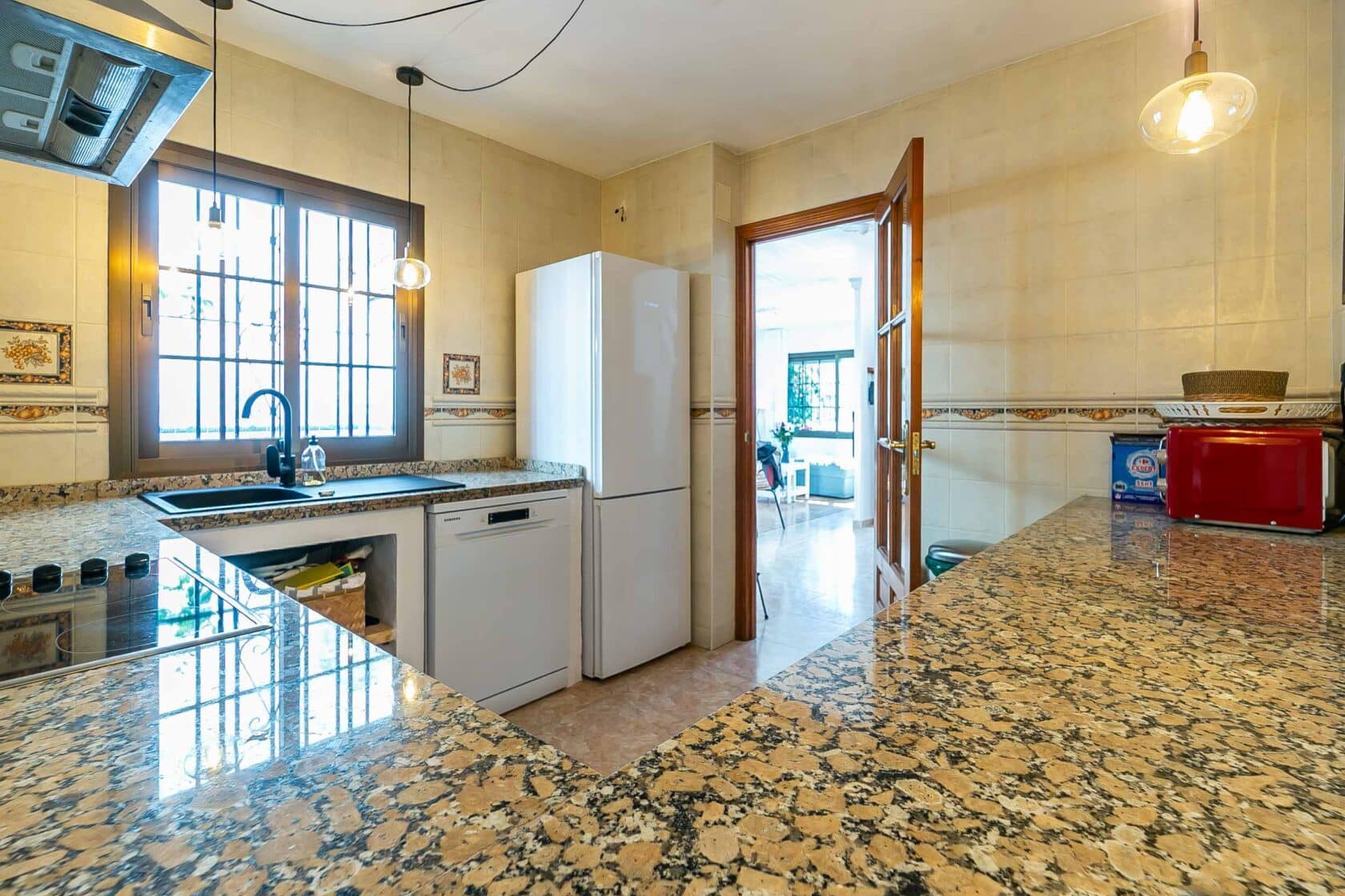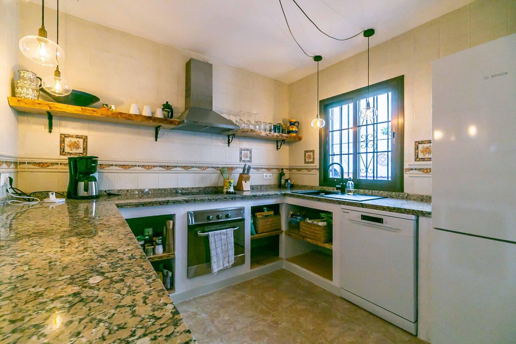 This andalusian spacious townhouse is designed across three levels to maximize comfort and leisure. On the ground floor, you’ll find a bright and tastefully furnished living-dining area with a comfortable sofa, Smart TV, and dining table for six. The space opens directly onto a private patio with an outdoor dining setup, perfect for relaxing or enjoying alfresco meals.