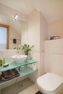 The modern kitchen is fully equipped with high-end appliances and everything you need to prepare meals at home. This level also includes a serene double bedroom and a sleek, contemporary bathroom, ideal for guests or a bit of extra privacy.