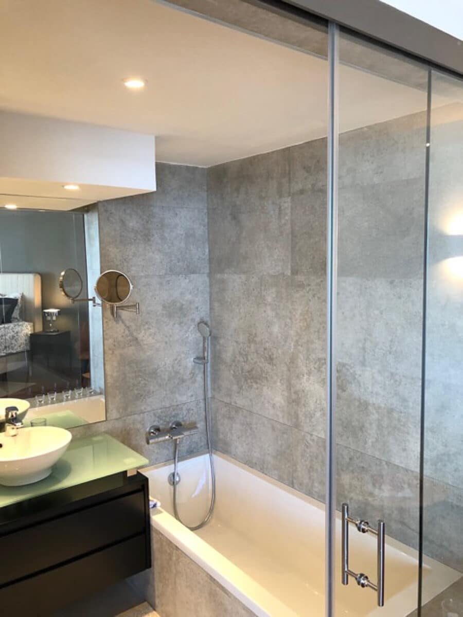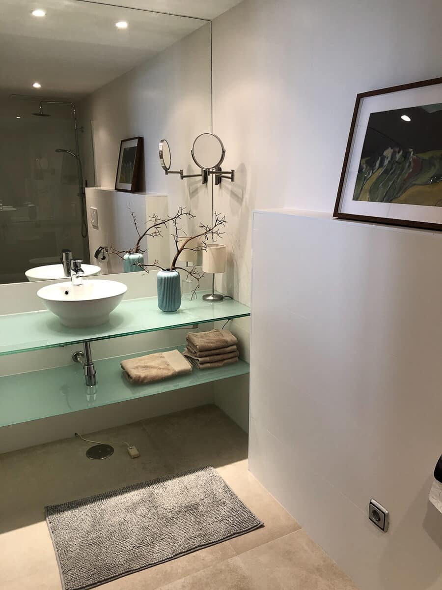 The property offers 180m2 of pure comfort. As you step into the lower level of this beautifully designed duplex, you’re immediately drawn to the floor-to-ceiling windows that showcase a breathtaking panorama of the sea and mountains. The open-plan layout is flooded with natural light, featuring a spacious lounge area with a comfortable sofa and a stylish dining space that seats up to eight guests. Between the lounge and dining area, elegant foldable glass panels allow for a seamless transition or separation depending on your needs. The dining space opens up entirely thanks to fully retractable glass doors, transforming into a sun-drenched, south-facing terrace – the perfect spot to relax while soaking in the spectacular views.