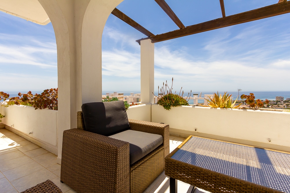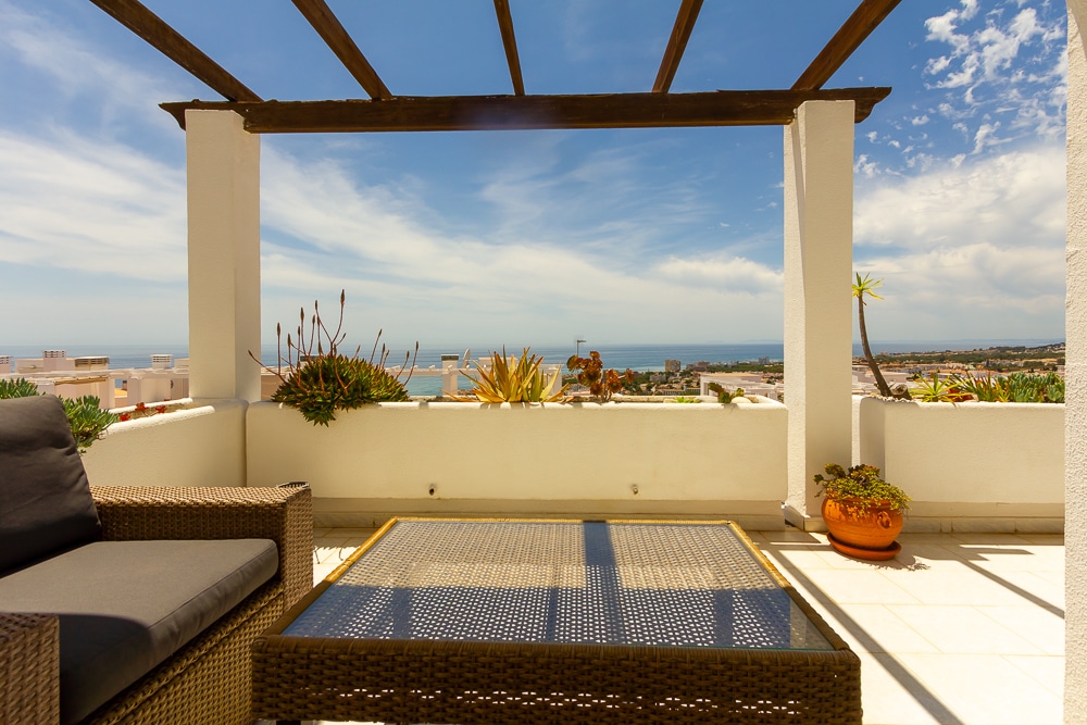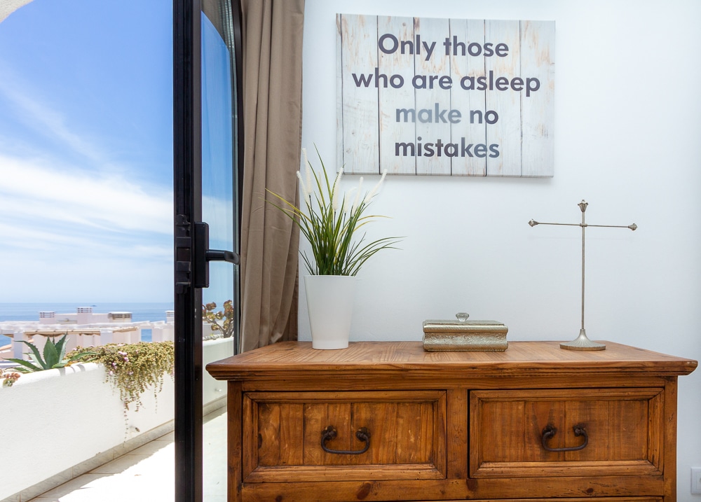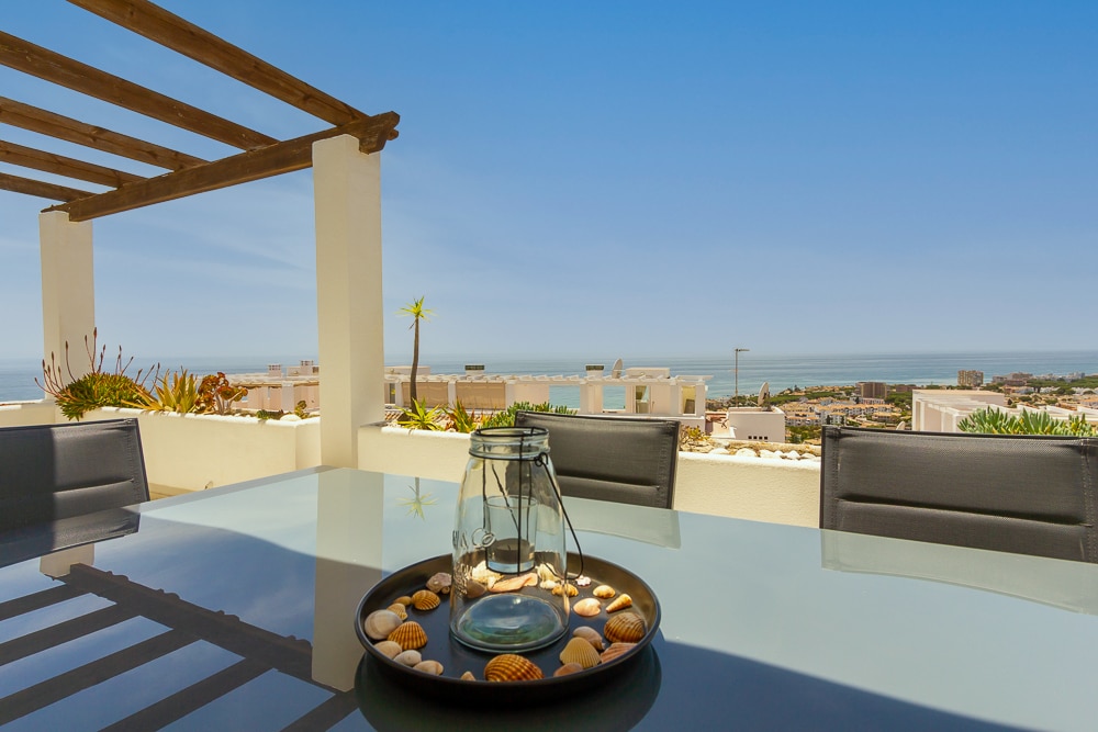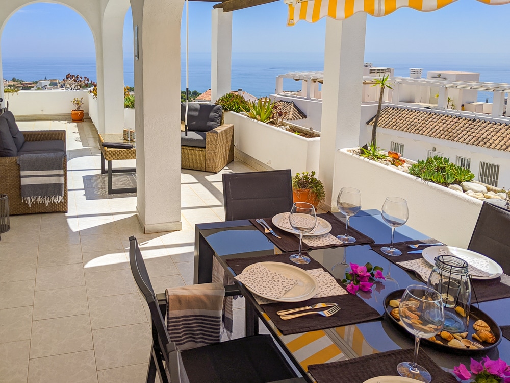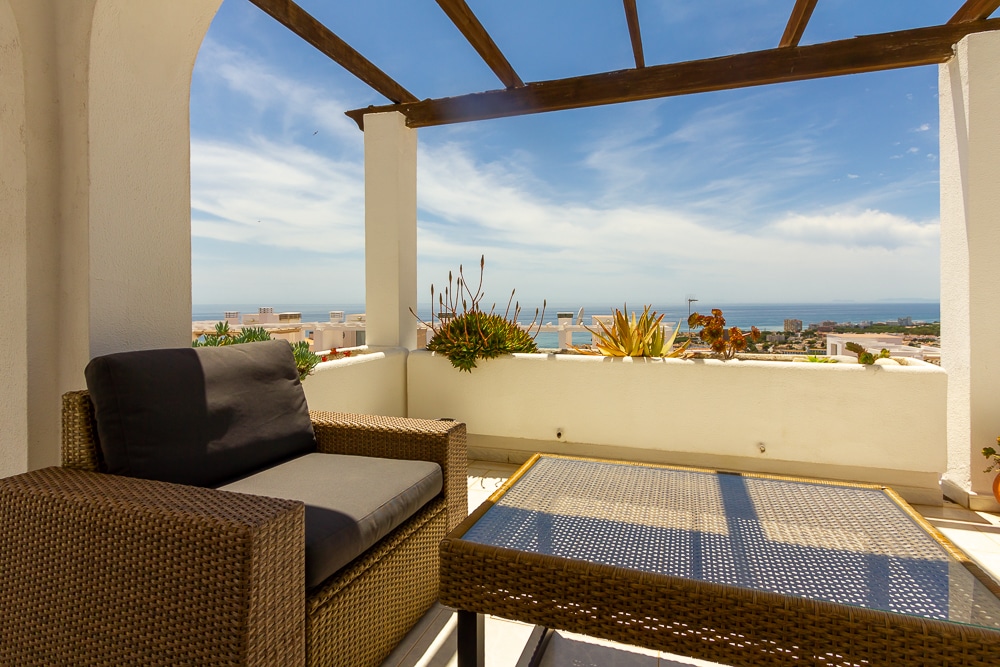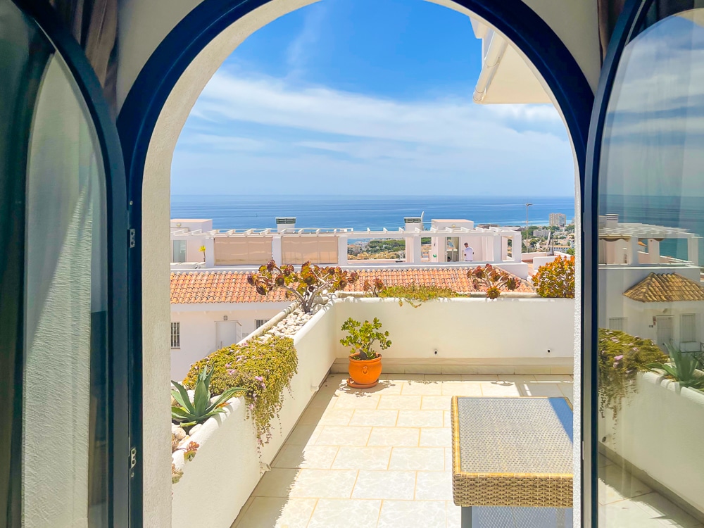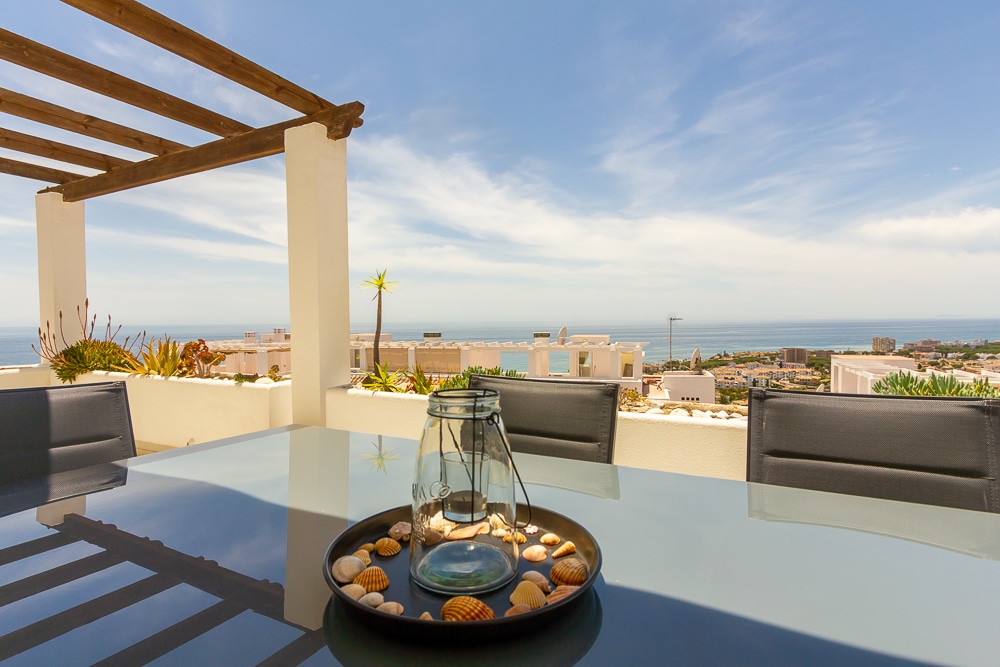 The apartment consists of a bright and welcoming hall entrance, 3 spacious and bright bedrooms ready for 6 people. 2 modern bathrooms, a south-facing terrace with lots of sun and with stunning views over the ocean, mountains and the urbanization, completely furnished with high quality sofas, dining table and sunbeds. A great place to watch the sunset, a spacious and bright living /dining room with direct access to the terrace, fully equipped kitchen, free community parking space a large community pool with relaxing area equipped with fitted garden furniture and a children pool.