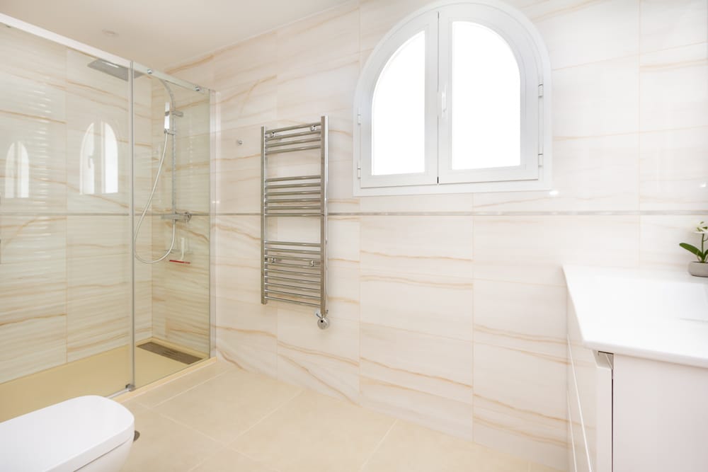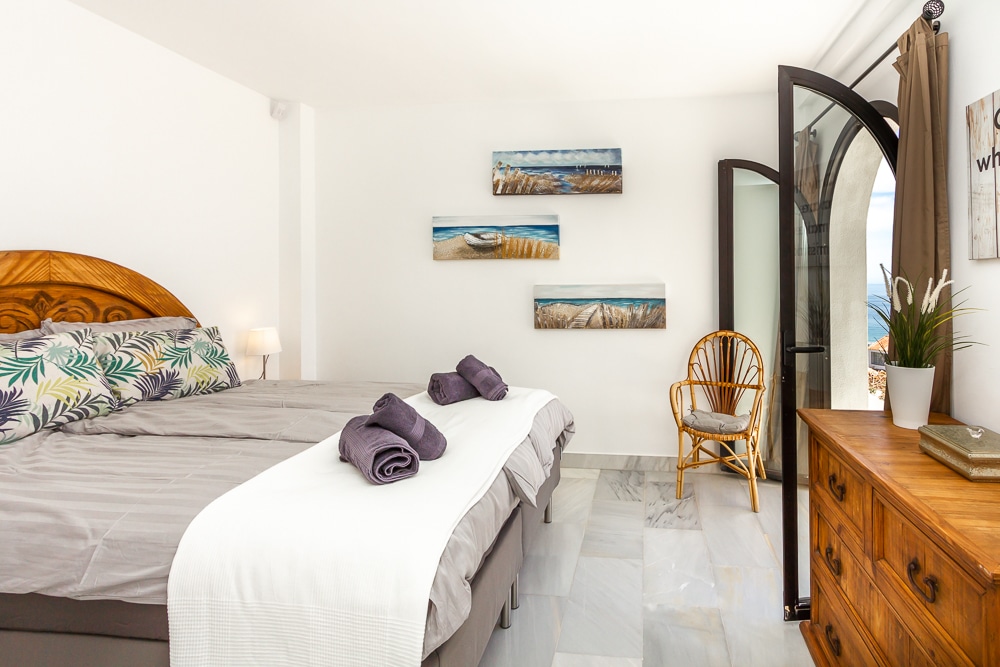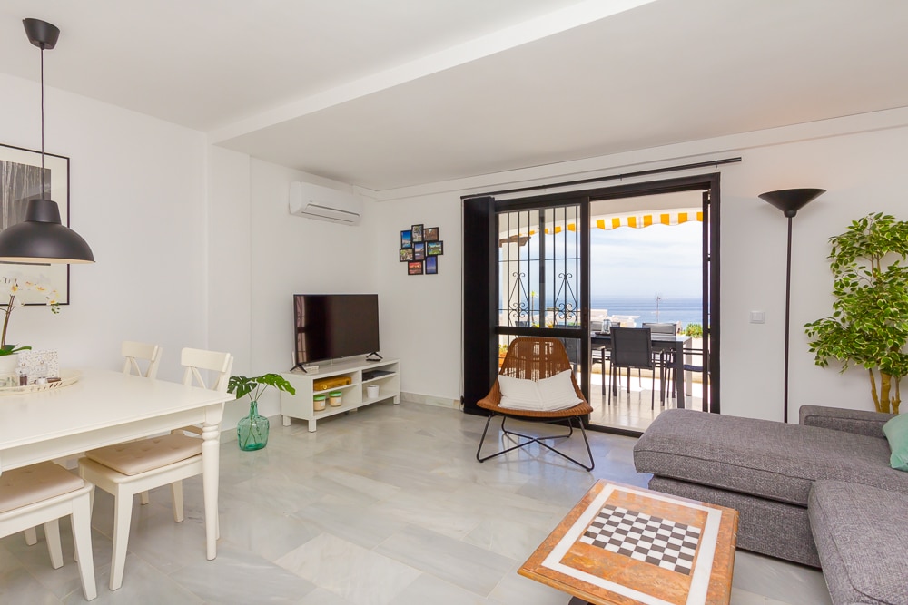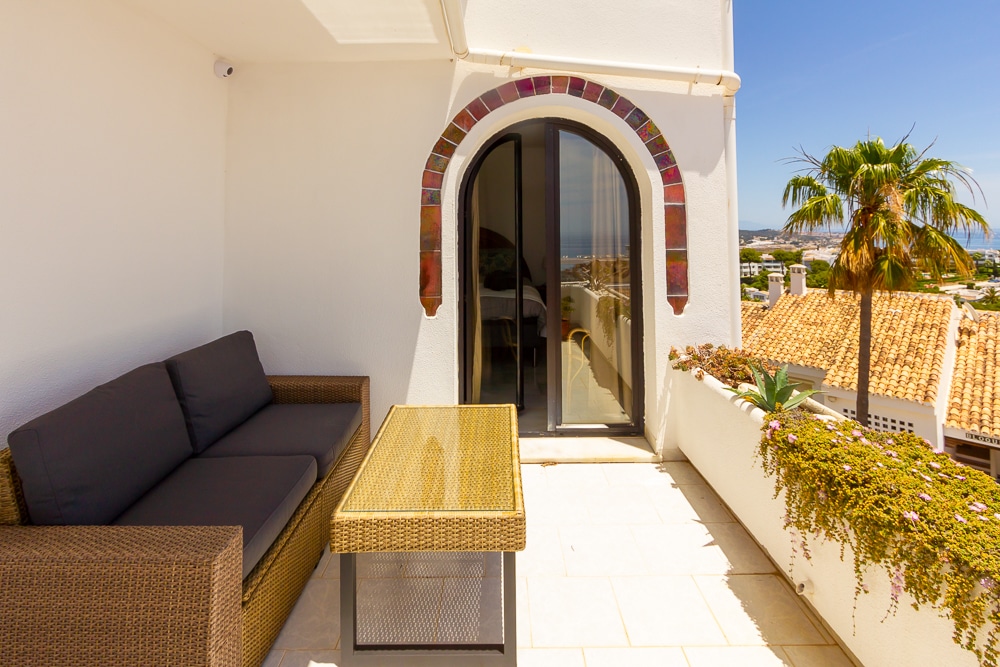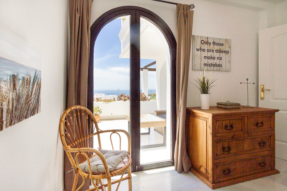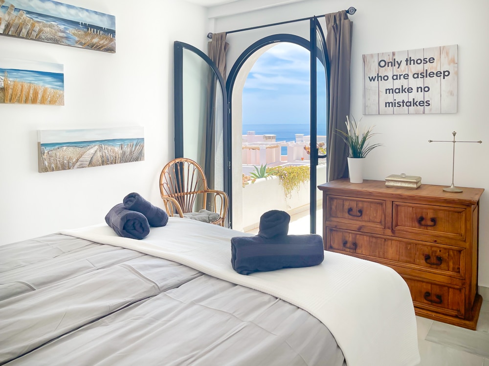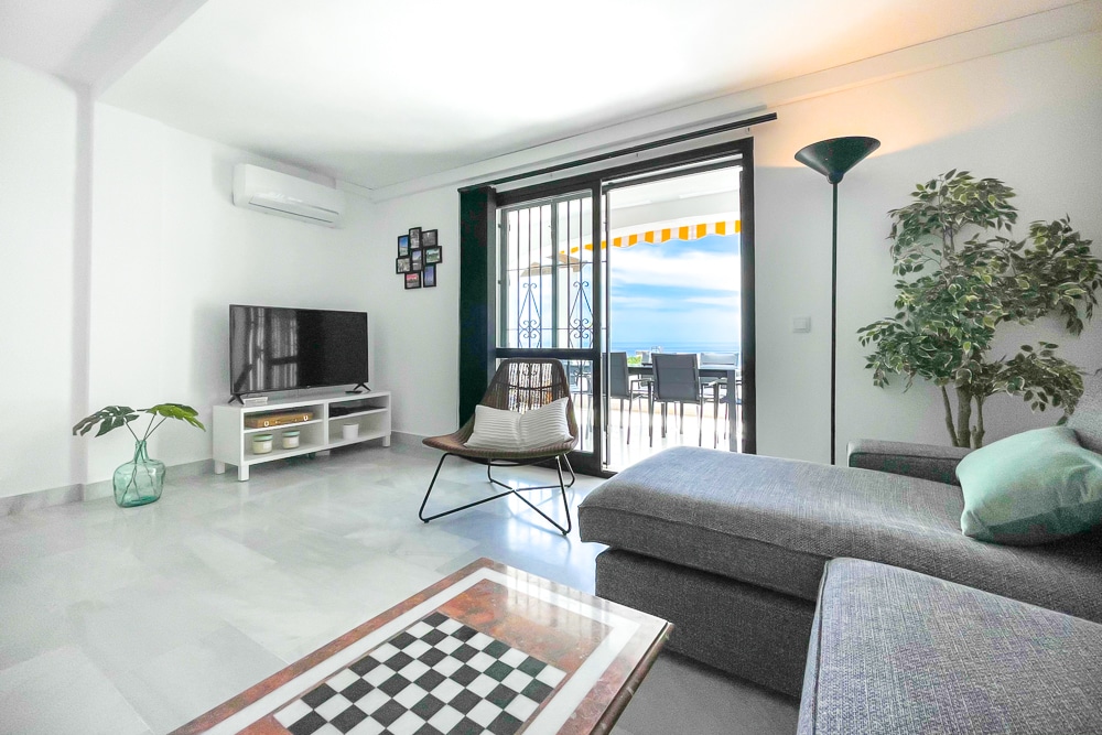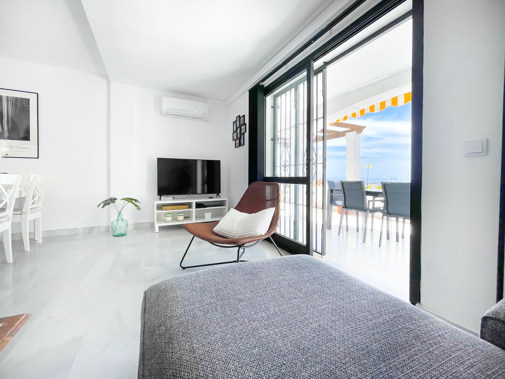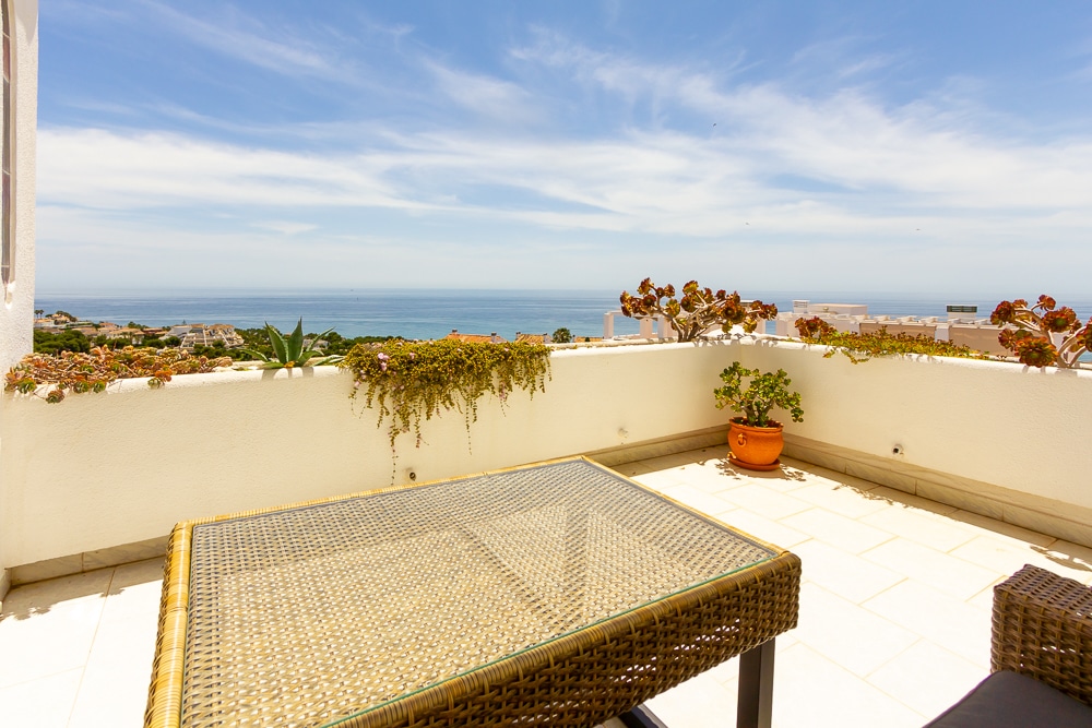 The apartment consists of a bright and welcoming hall entrance, 3 spacious and bright bedrooms ready for 6 people. 2 modern bathrooms, a south-facing terrace with lots of sun and with stunning views over the ocean, mountains and the urbanization, completely furnished with high quality sofas, dining table and sunbeds. A great place to watch the sunset, a spacious and bright living /dining room with direct access to the terrace, fully equipped kitchen, free community parking space a large community pool with relaxing area equipped with fitted garden furniture and a children pool.
