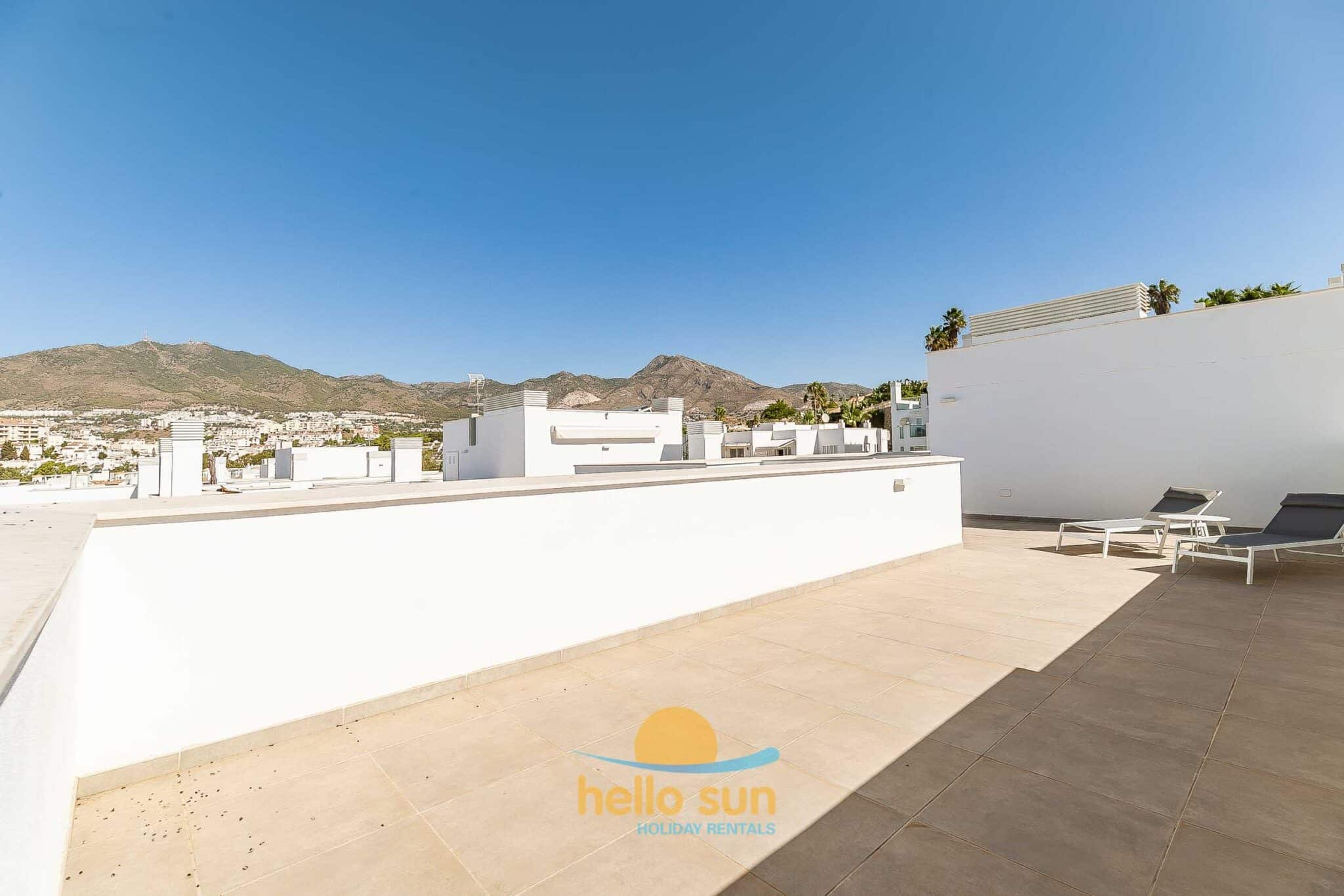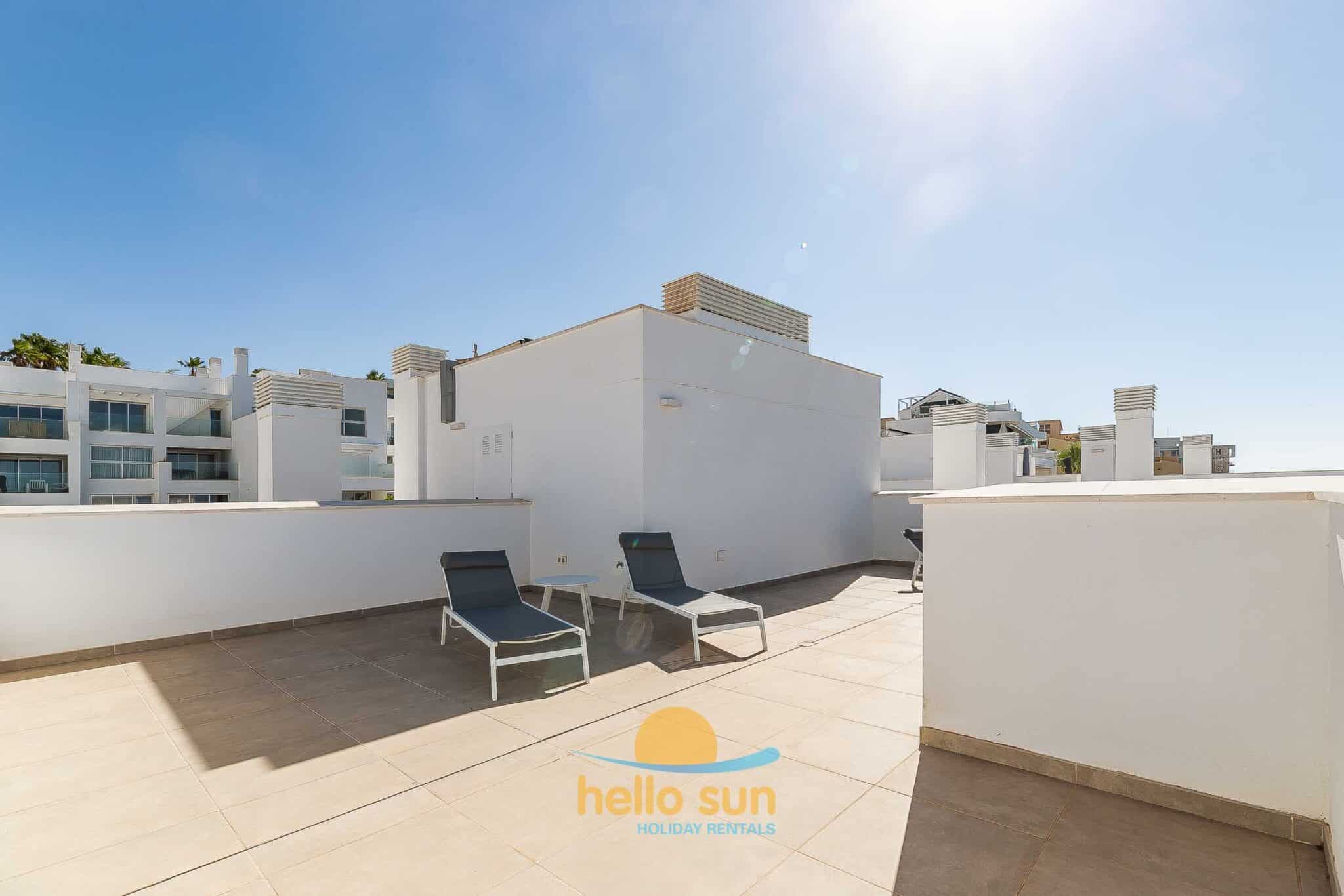 The apartment consists of 3 large bedrooms and 2 bathrooms, the master bedroom with ensuite bathroom, a very bright and comfortable dining/living room with direct access to the terrace, a fully equipped open kitchen integrated in the living room with a large kitchen island where you will enjoy cooking your favourite dishes, a large south facing terrace and a 67m2 large roof terrace with stunning views.