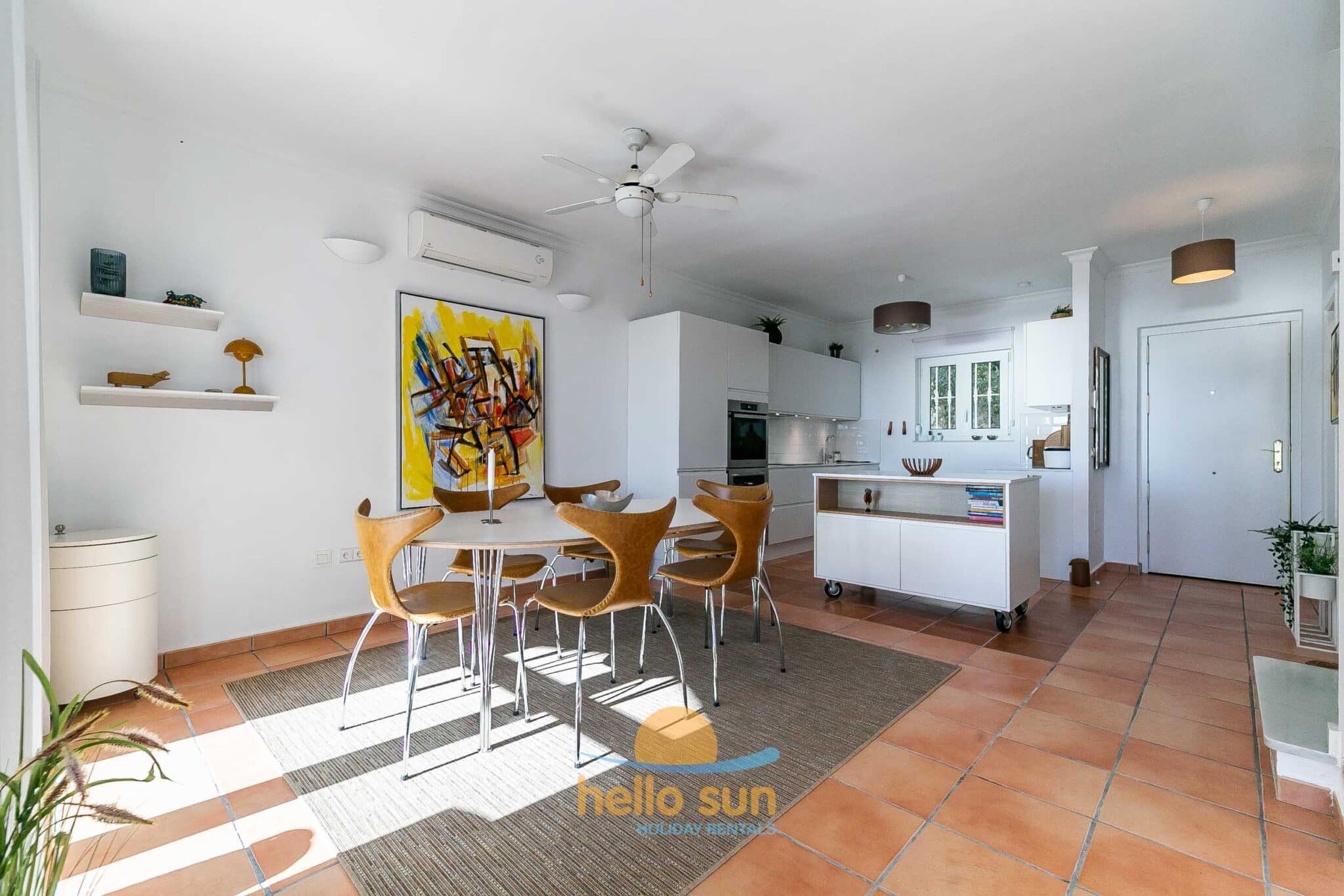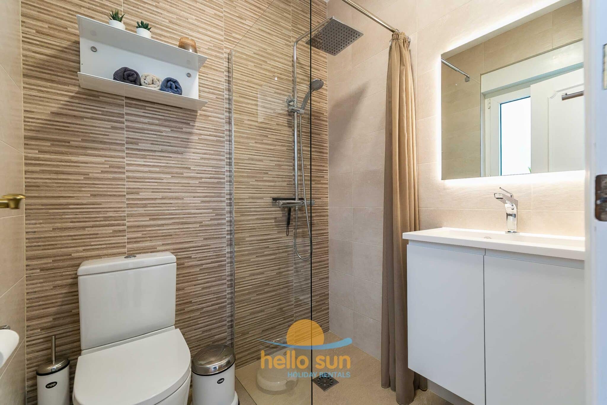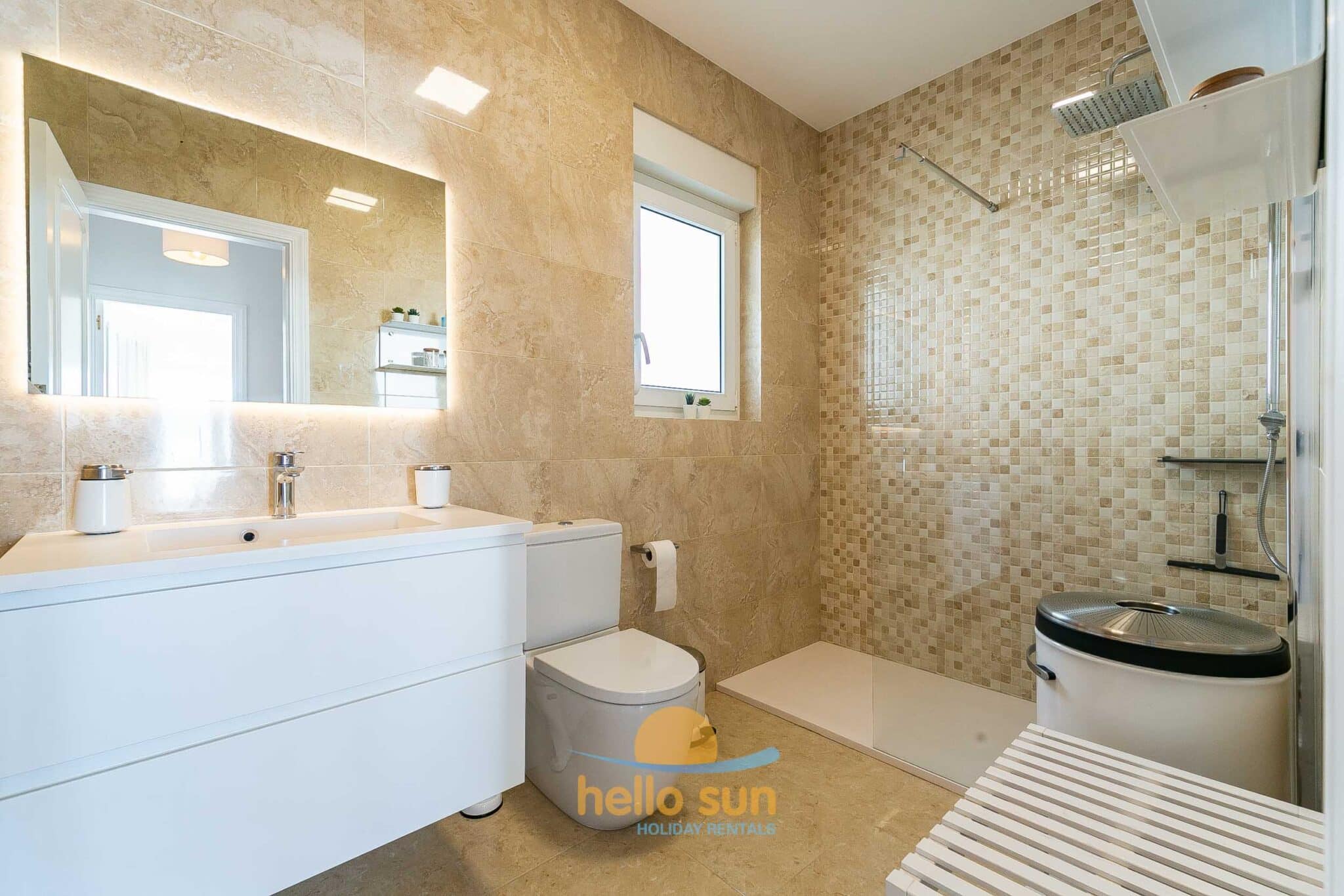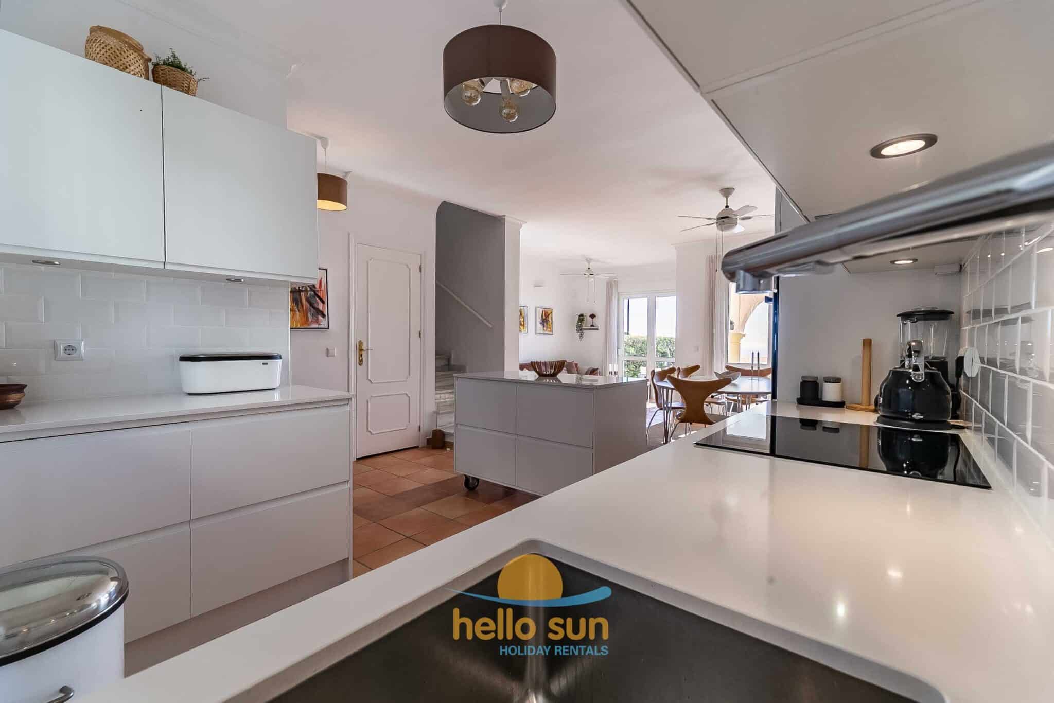 The house is in 2 levels and features 3 spacious bedrooms with fitted wardrobes, 2 modern bathrooms with showers, a spacious and bright living/dining room and an open kitchen with all appliances. From the living/dining room there is direct access to a very large terrace, where the first part is covered, and the rest uncovered. There is also a spacious balcony/terrace with access from the bedrooms on the second floor. The views from the terraces are stunning. These are the places where you enjoy the sun all day long and relax.