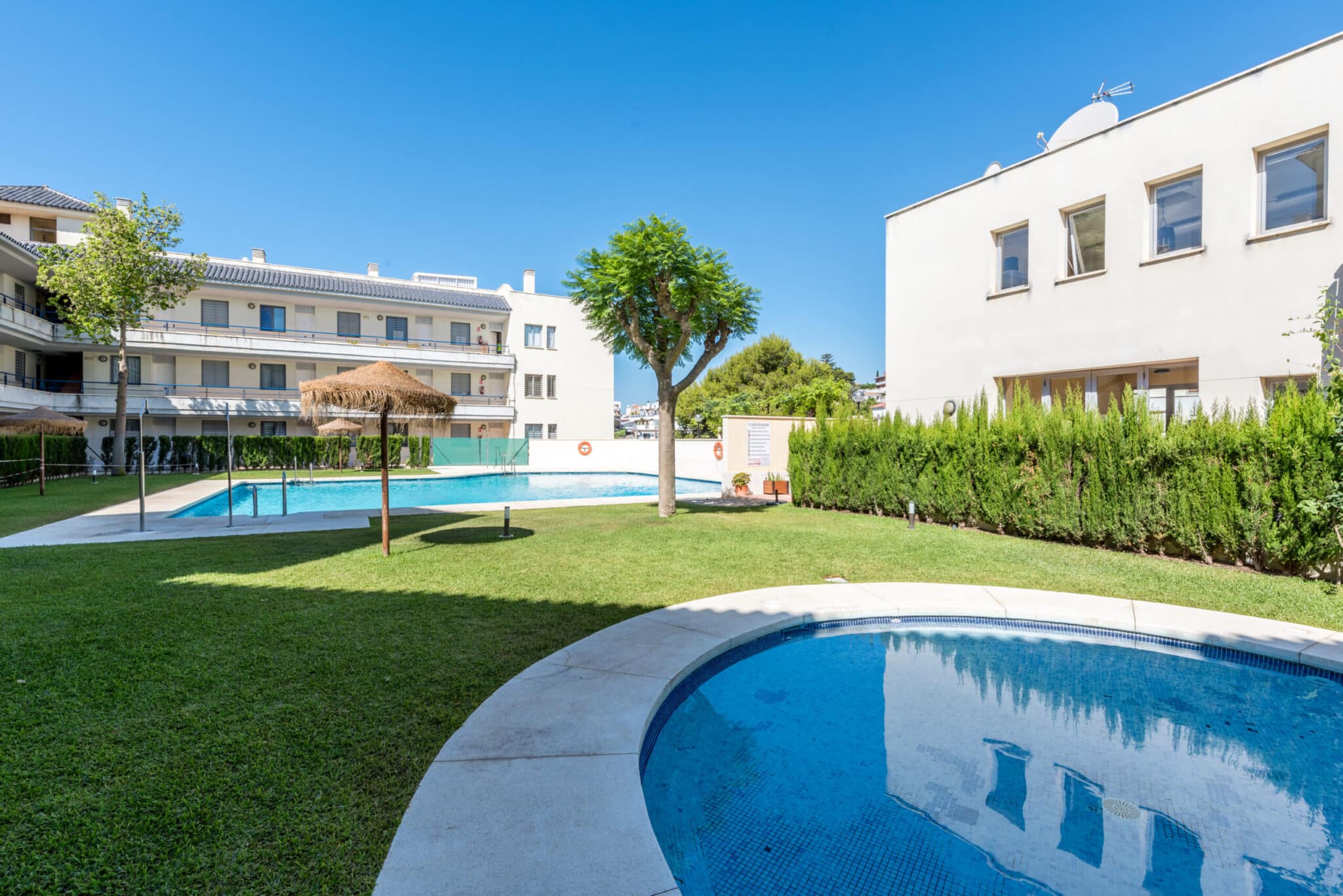 The urbanization is very well-maintained and has a large pool and a children’s pool (approx. from 10/6-15/9), gym with table tennis and padel court, green lawns with parasols. There is a free private parking in the basement available for the guests and there are elevators, which takes you directly from the basement to the apartment.