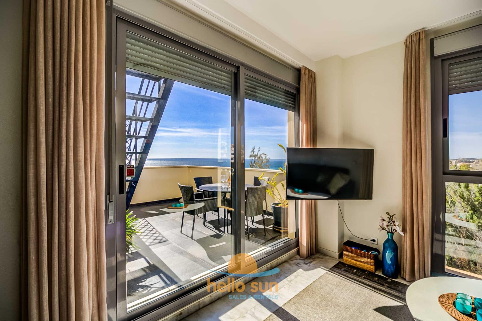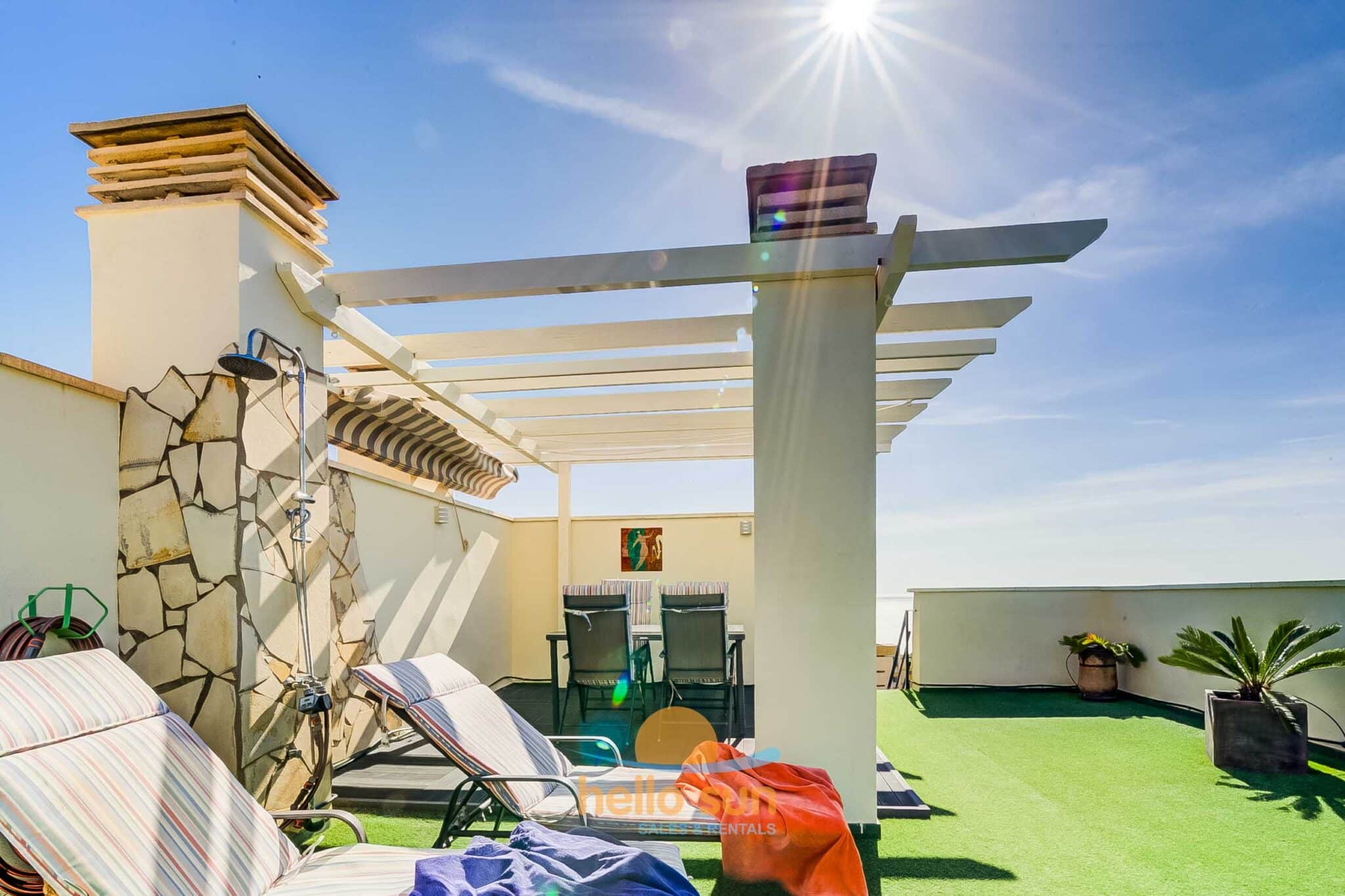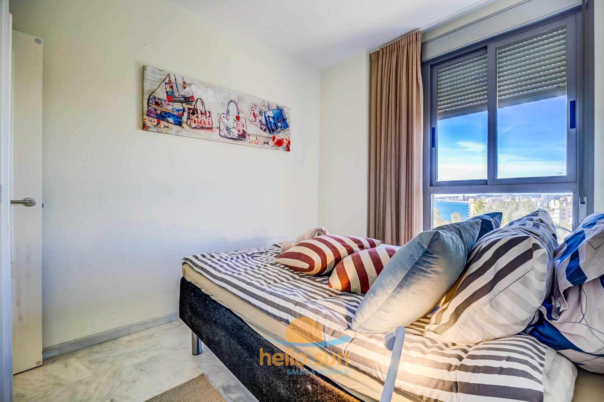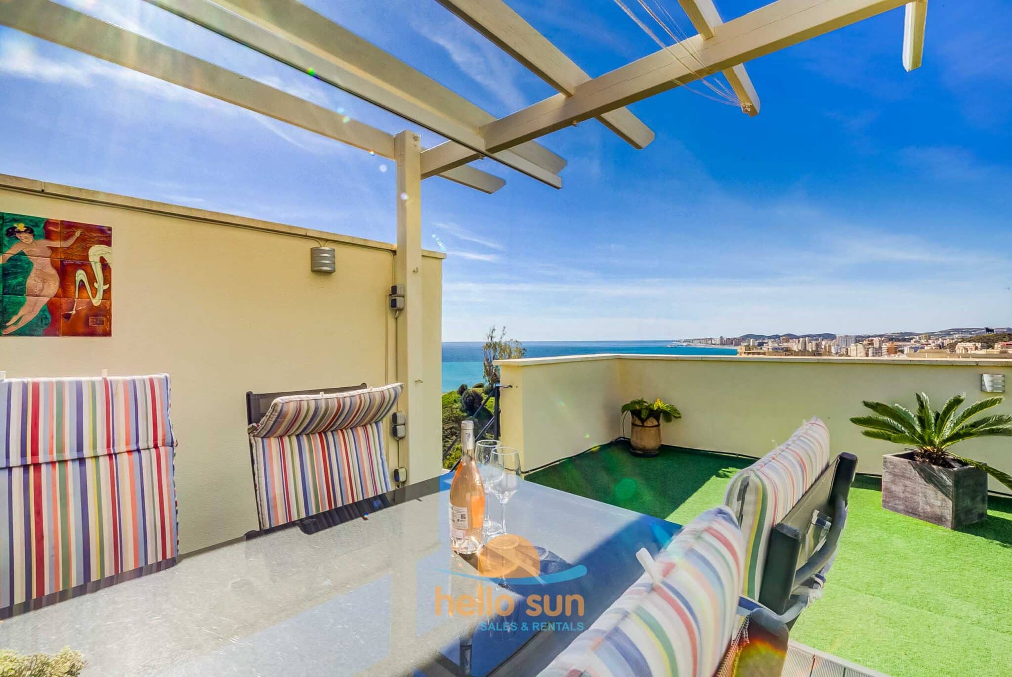 The apartment is situated in a gated urbanization and consists of 2 bedrooms with fitted wardrobes, 2 complete bathrooms, one of them fully renovated, with comfortable showers, a bright living/dining room with direct access to the terrace. The sofa in the living room is a convertible sofa bed (200 x 140) , a fully equipped kitchen with all appliances, a laundry room with washing machine & dryer, a sunny south west facing terrace with fantastic views over the Mediterranean Ocean and Africa (when the sky is clear), the city and mountains, and a huge 75 m2 roof terrace with lots of sun all day long, part of it as a conservatory, where you can enjoy the roof terrace also in windy days or in the winter. The views from both terraces are breathtaking over the Mediterranean Sea and mountains.