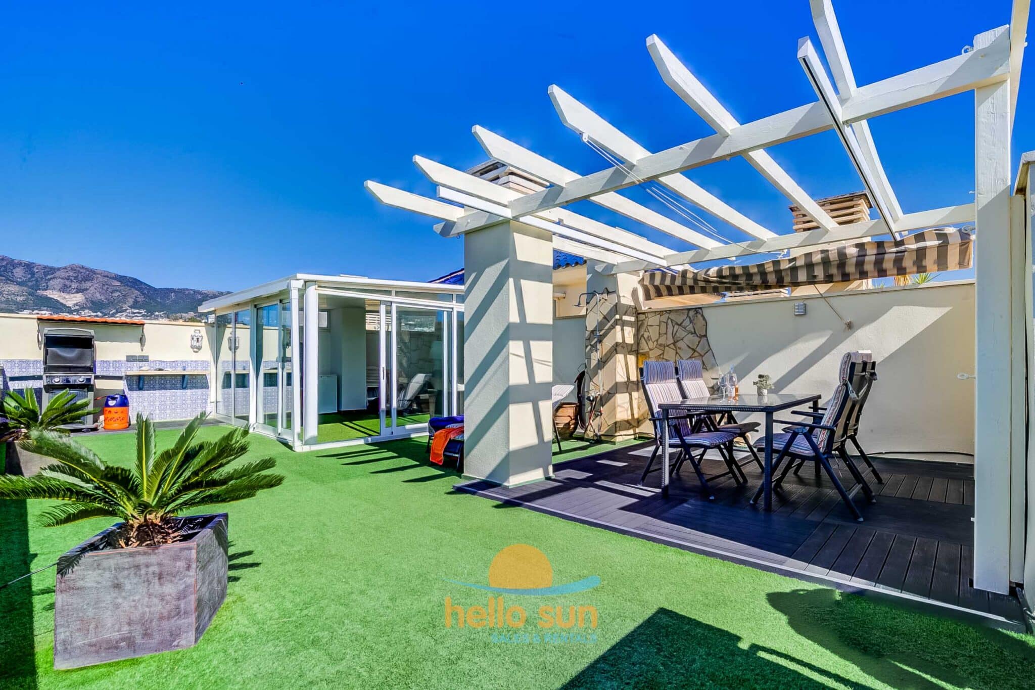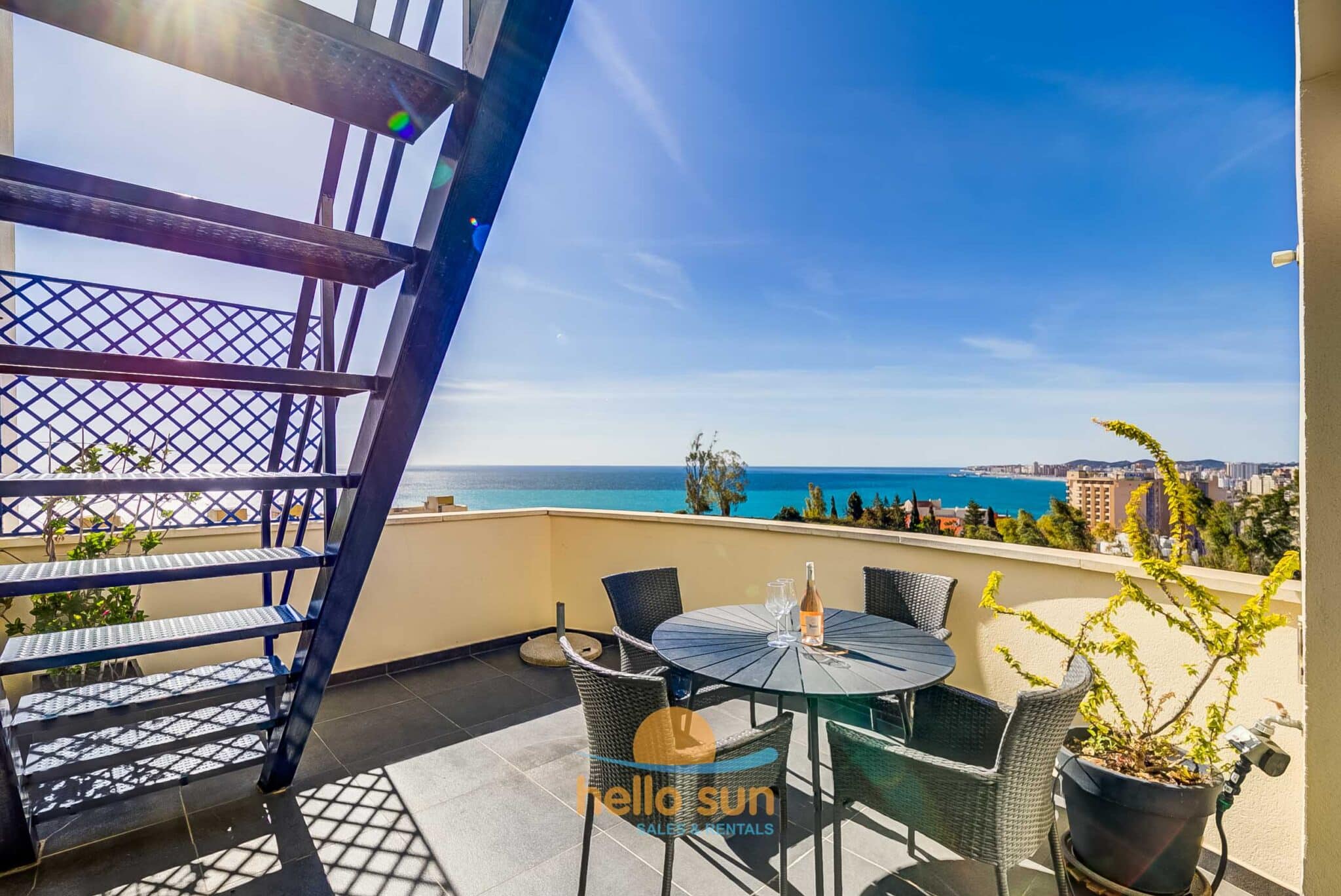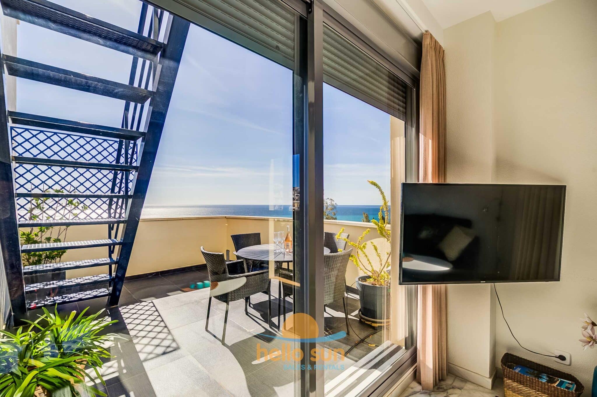 The apartment is situated in a gated urbanization and consists of 2 bedrooms with fitted wardrobes, 2 complete bathrooms, one of them fully renovated, with comfortable showers, a bright living/dining room with direct access to the terrace. The sofa in the living room is a convertible sofa bed (200 x 140) , a fully equipped kitchen with all appliances, a laundry room with washing machine & dryer, a sunny south west facing terrace with fantastic views over the Mediterranean Ocean and Africa (when the sky is clear), the city and mountains, and a huge 75 m2 roof terrace with lots of sun all day long, part of it as a conservatory, where you can enjoy the roof terrace also in windy days or in the winter. The views from both terraces are breathtaking over the Mediterranean Sea and mountains.