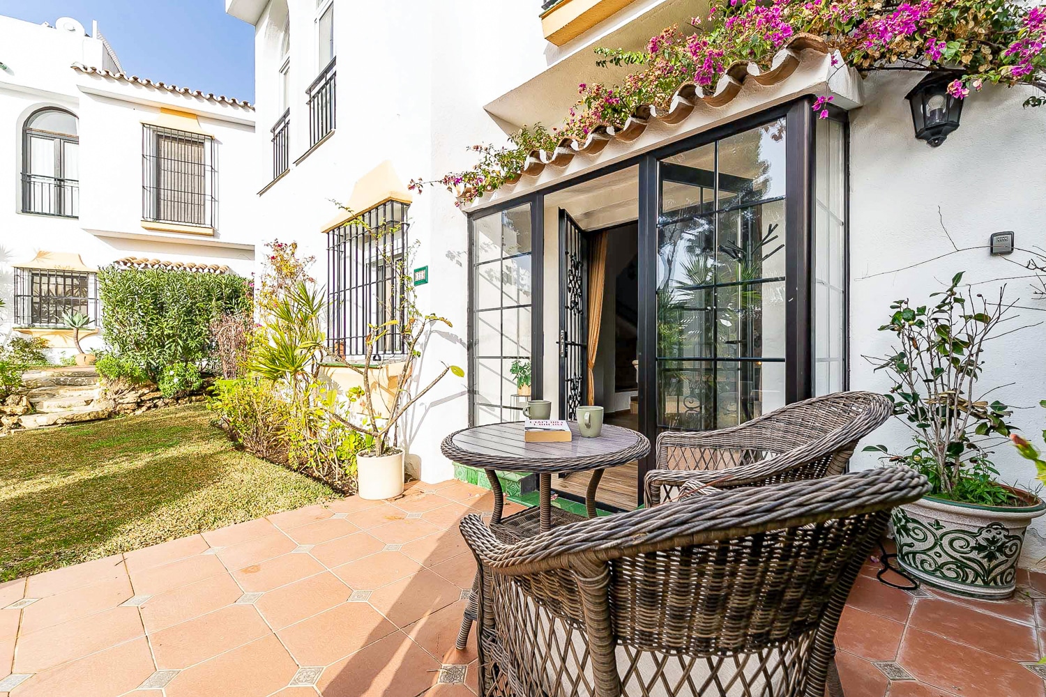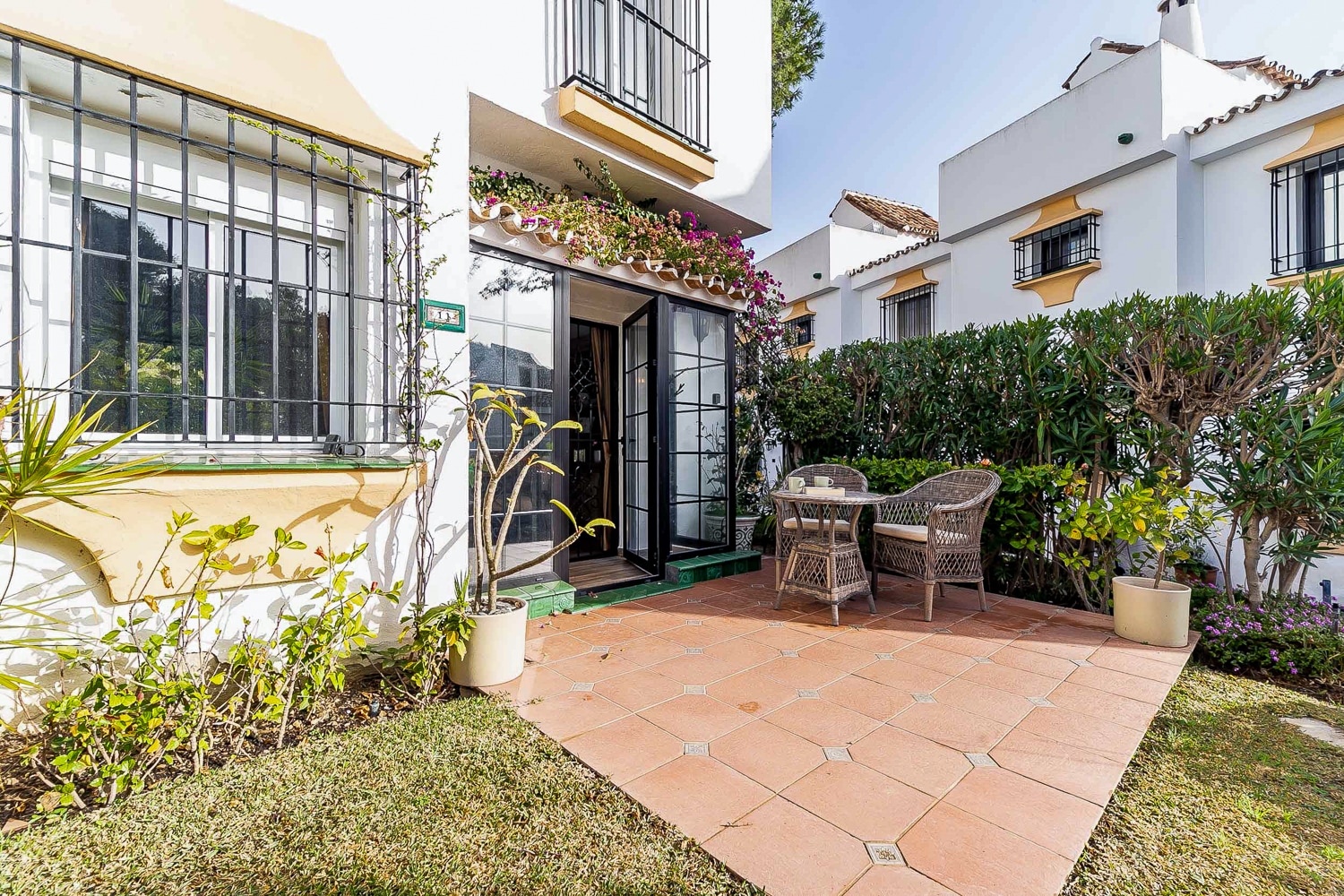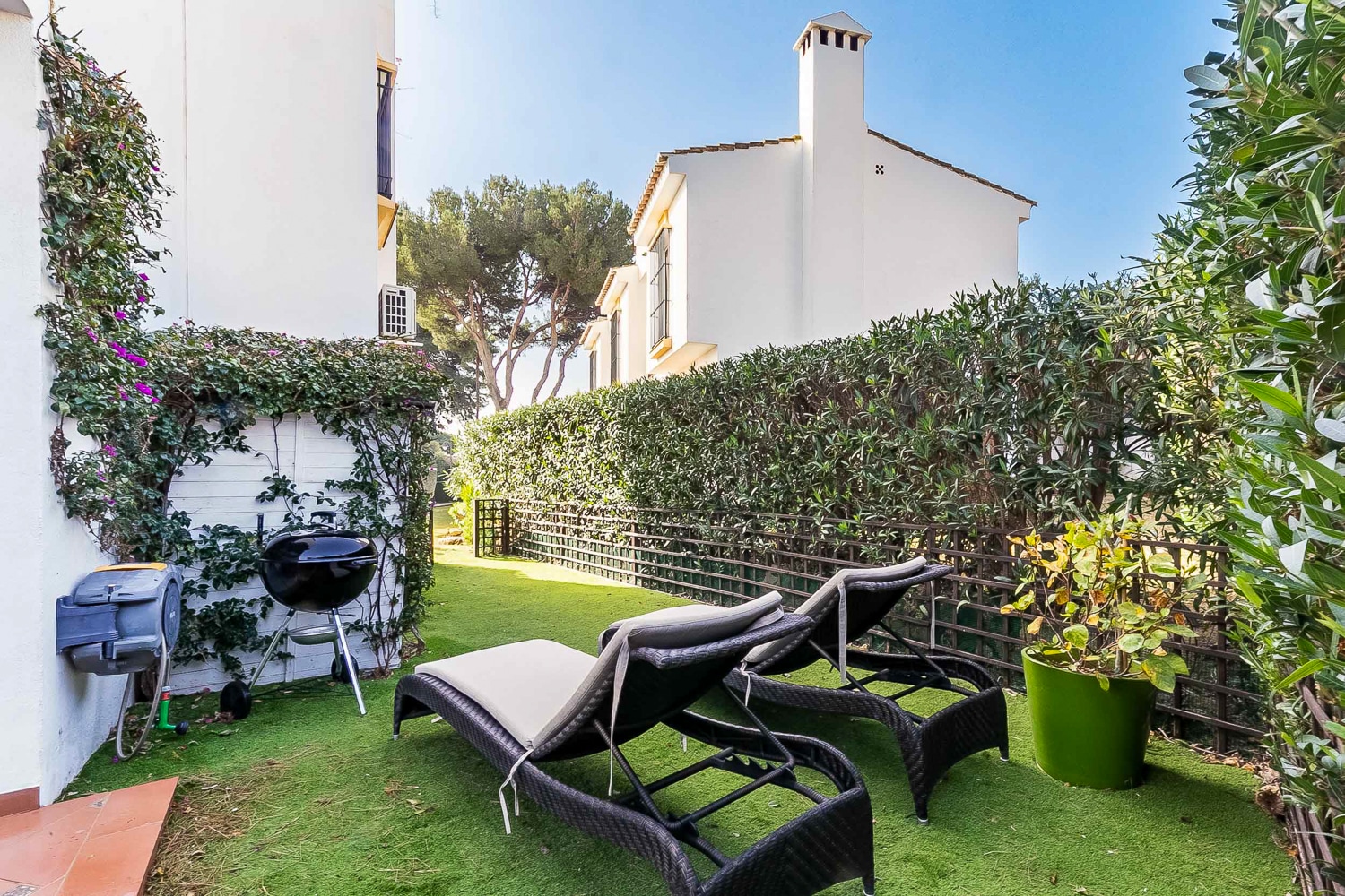 The house is on 110 m2 in modern rustic style and is in two levels. It features 2 bedrooms with fitted wardrobes and double beds, a very spacious bathroom with shower and bathtub, a fully equipped kitchen with all appliances, a bright living/dining room with fireplace, a laundry room with washing machine and dryer, a guest toilet, a cozy private garden with green lawns and two terraces, and a spacious and sunny roof terrace with beautiful views over green areas and the town.