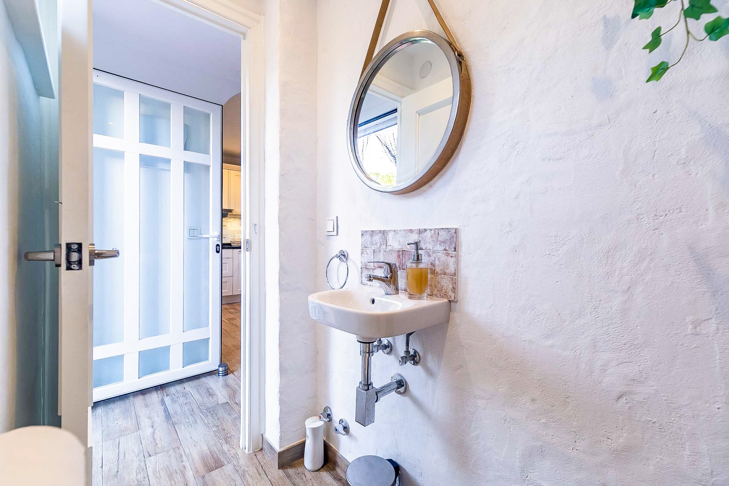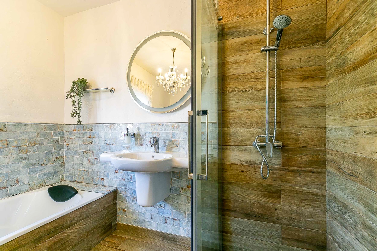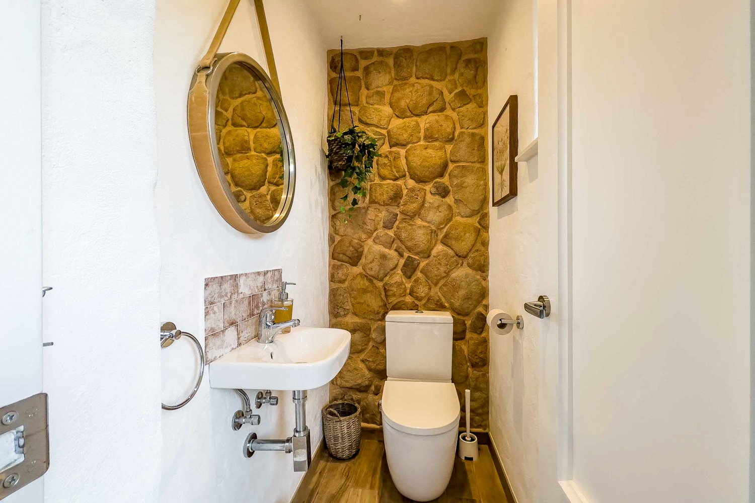 The house is on 110 m2 in modern rustic style and is in two levels. It features 2 bedrooms with fitted wardrobes and double beds, a very spacious bathroom with shower and bathtub, a fully equipped kitchen with all appliances, a bright living/dining room with fireplace, a laundry room with washing machine and dryer, a guest toilet, a cozy private garden with green lawns and two terraces, and a spacious and sunny roof terrace with beautiful views over green areas and the town.