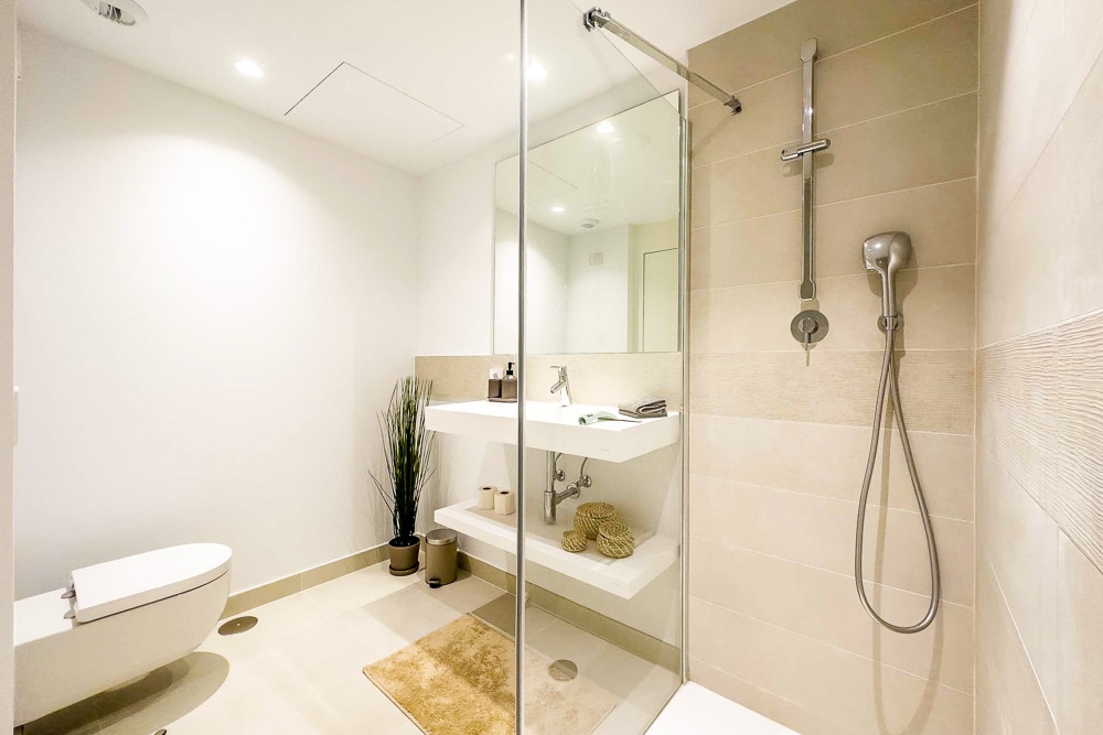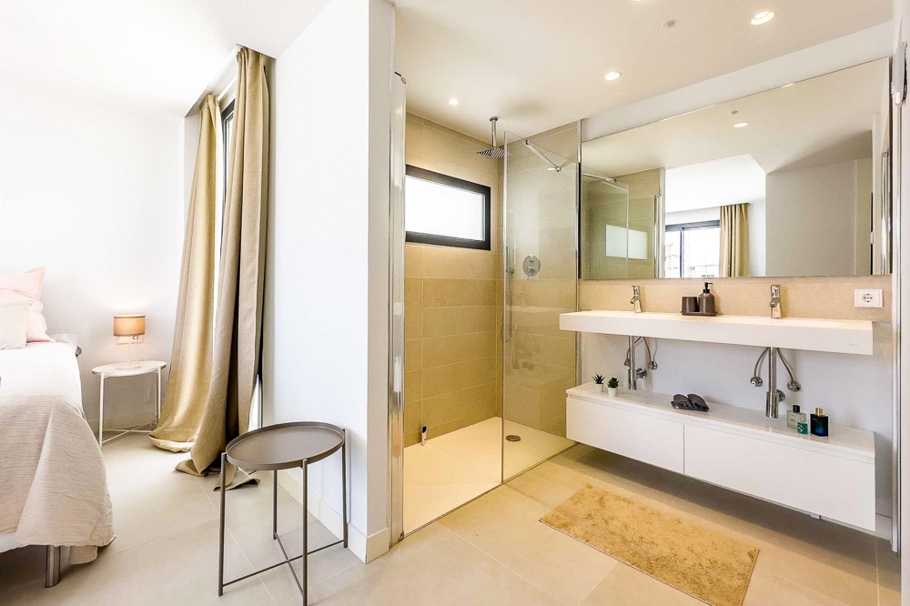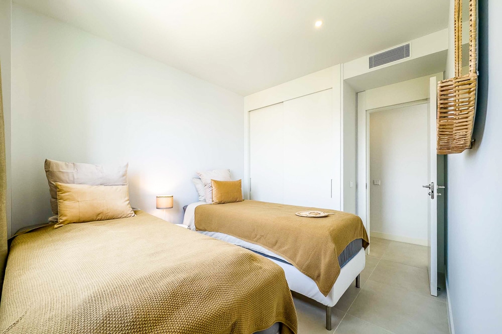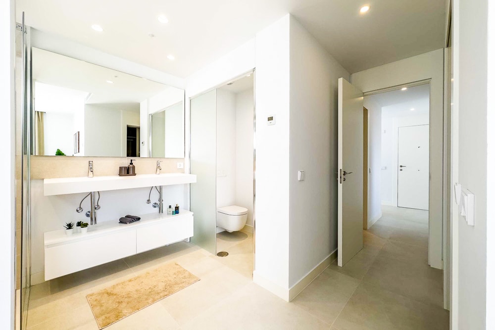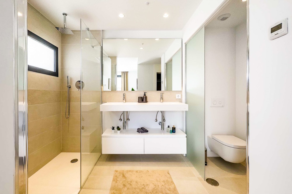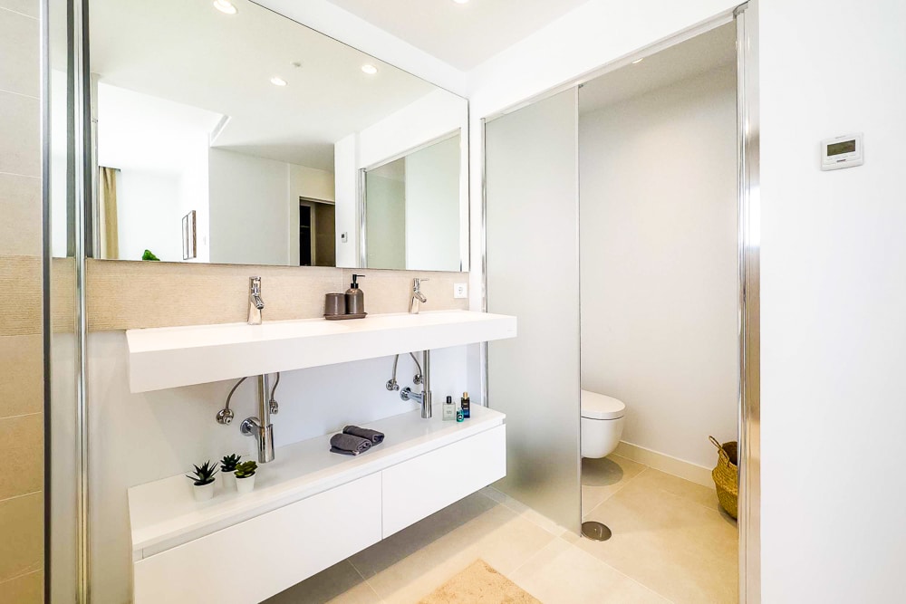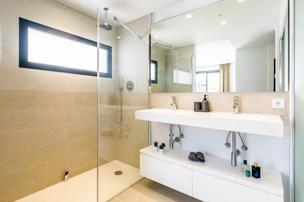 2 bedrooms, one of them a spacious master bedroom with walk-in closet and ceiling to floor glass doors leading to the terrace, and the other one with fitted closets. There are 2 single beds in each bedroom, put together as a double bed. 2 modern and spacious bathrooms with showers, one of them “en suite” in the master bedroom, a spacious and bright living/ dining room with ceiling to floor glass doors and direct access to the terrace, a fully equipped open kitchen with all appliances, a laundry room, 2 terraces, the large south-east facing terrace of 36m2 with access from the living/dining room where you can enjoy your first cup of coffee or sunbathe until late noon. The second terrace, with access from the master bedroom, is 7 m2. Both of them have panoramic views, where you can relax and enjoy your holiday and meditating to the view of the stunning nature.