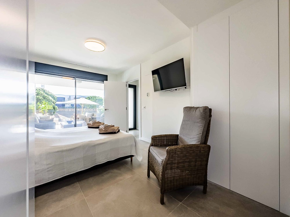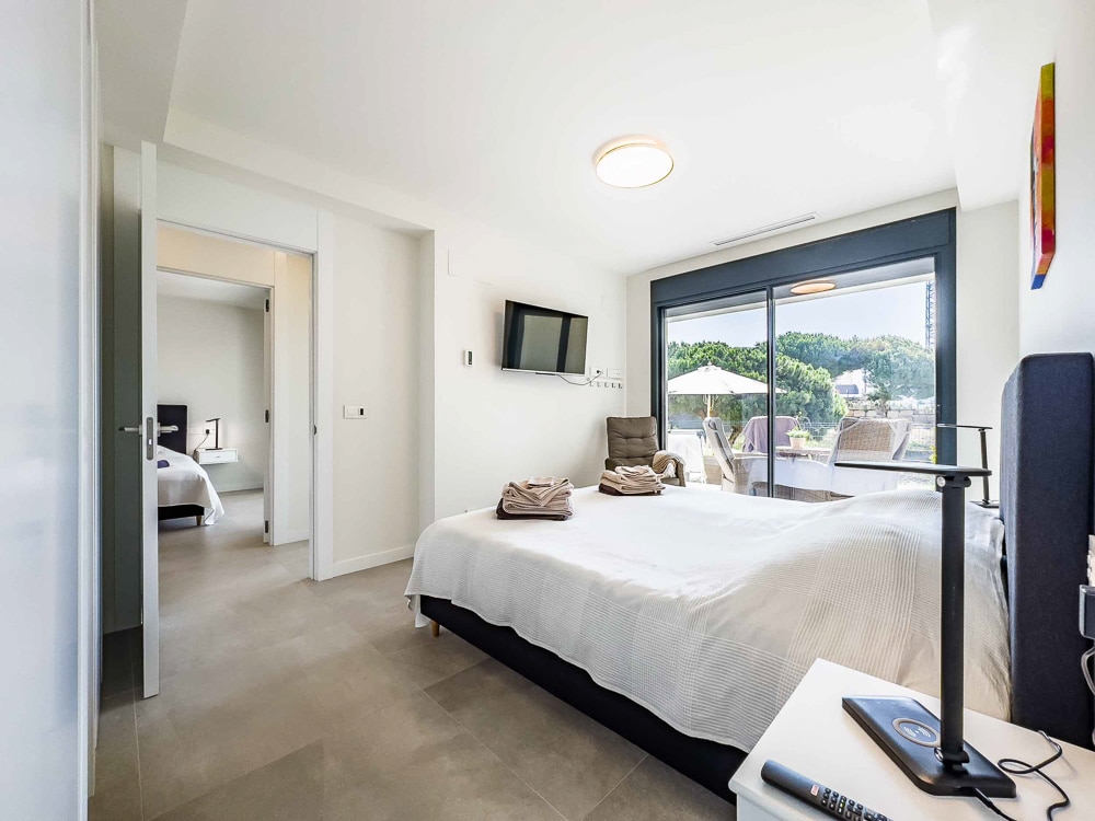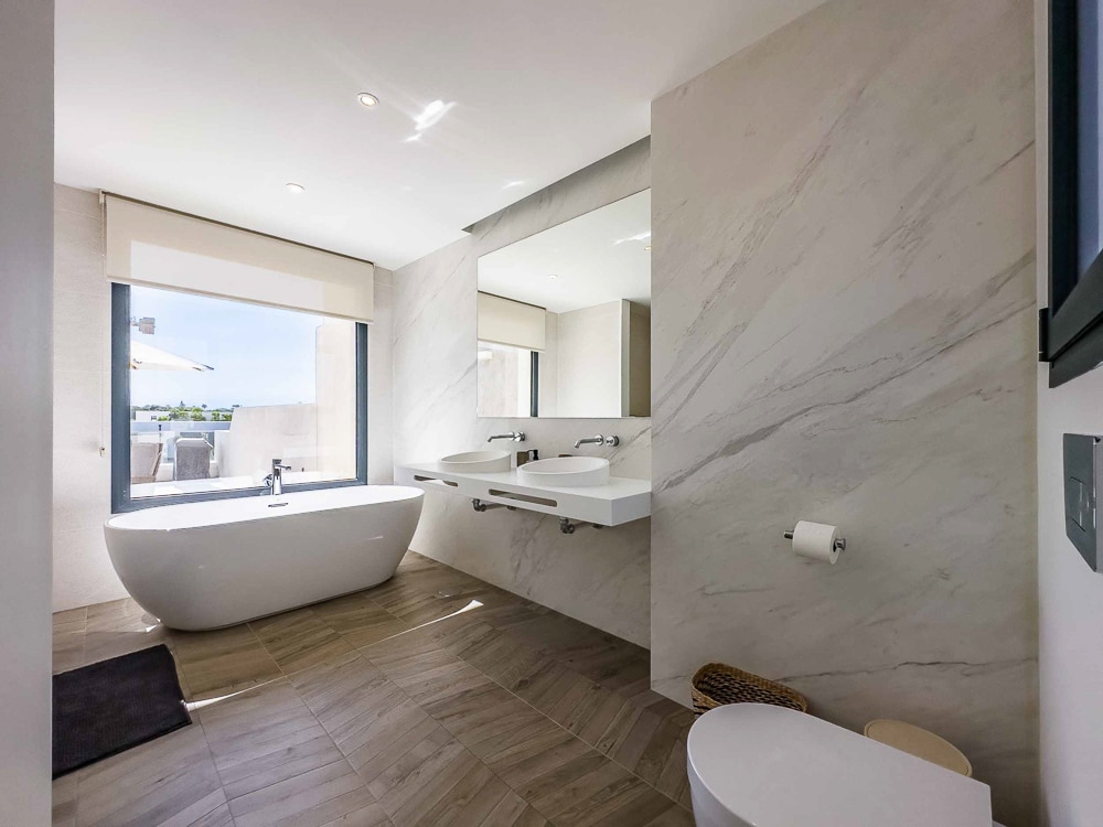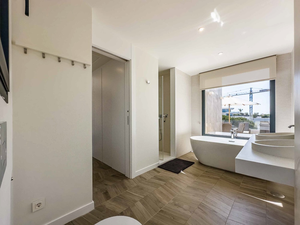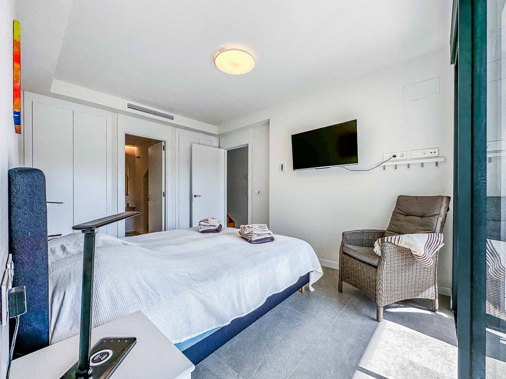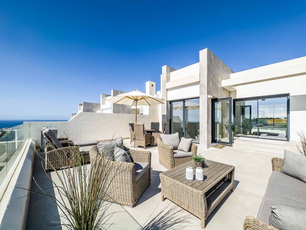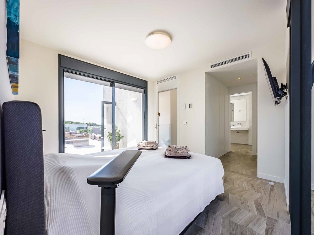 Features a spacious bedroom with fitted wardrobe, comfortable double bed, smart tv, spacious “en suite” bathroom with shower and modern bathtub, and ceiling to floor glass doors leading to a very large rooftop solarium with lots of sun and stunning views over the Mediterranean Sea, the mountains, golf courses and green areas. A perfect place for the balmy late evenings to relax and enjoy the night.