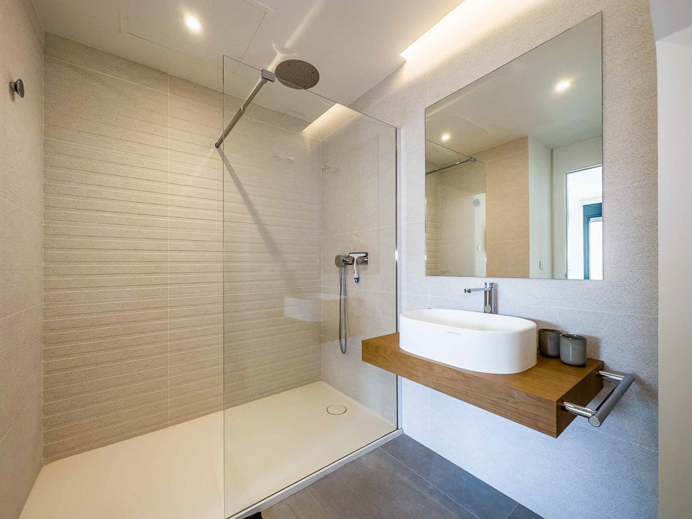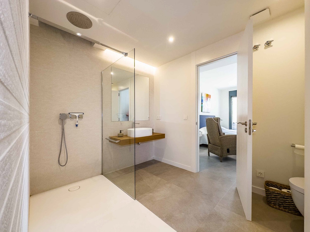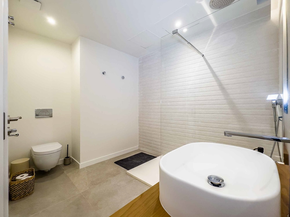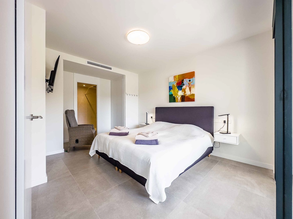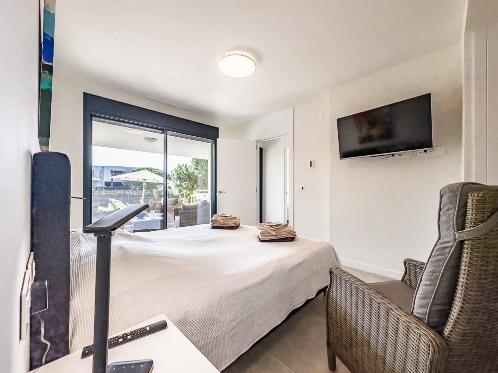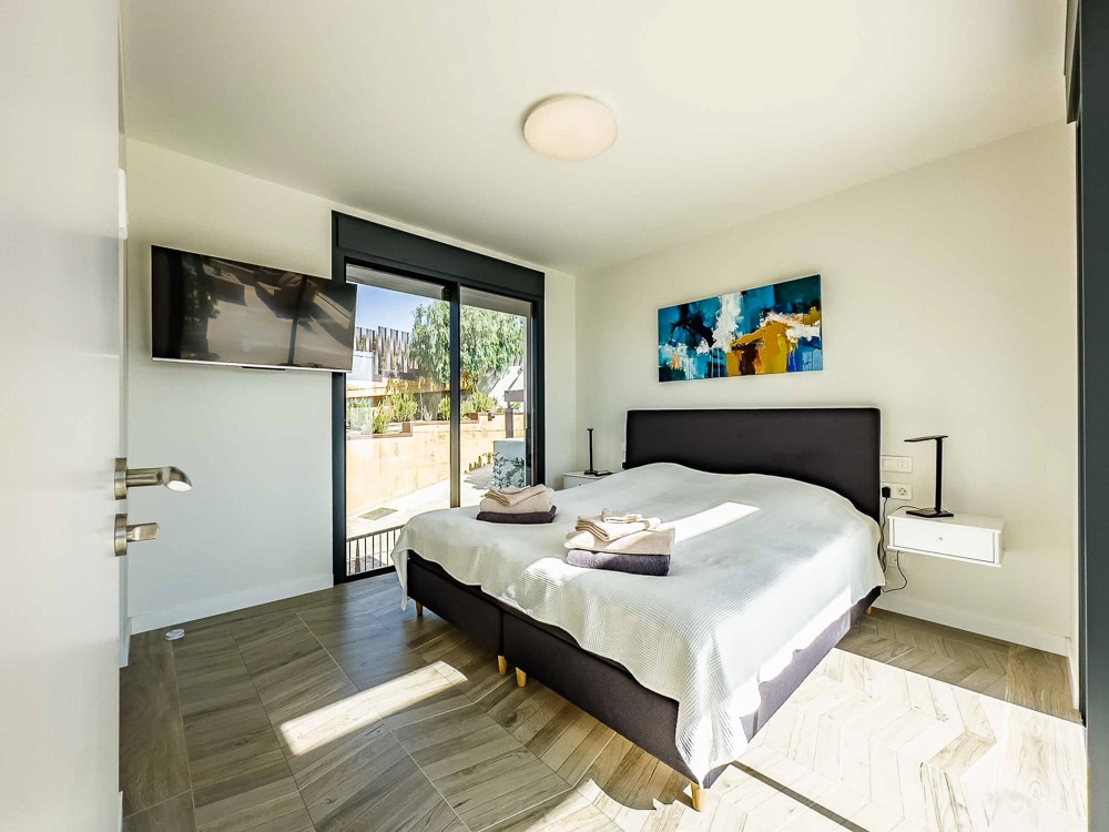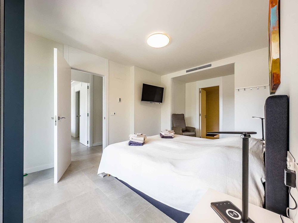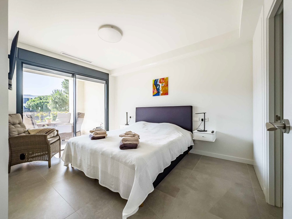 Features a spacious bedroom with fitted wardrobe, comfortable double bed, smart tv, spacious “en suite” bathroom with shower and modern bathtub, and ceiling to floor glass doors leading to a very large rooftop solarium with lots of sun and stunning views over the Mediterranean Sea, the mountains, golf courses and green areas. A perfect place for the balmy late evenings to relax and enjoy the night.
