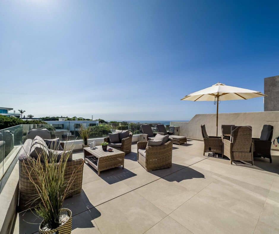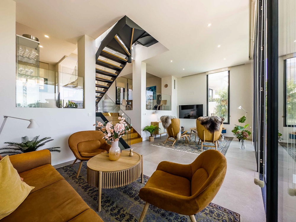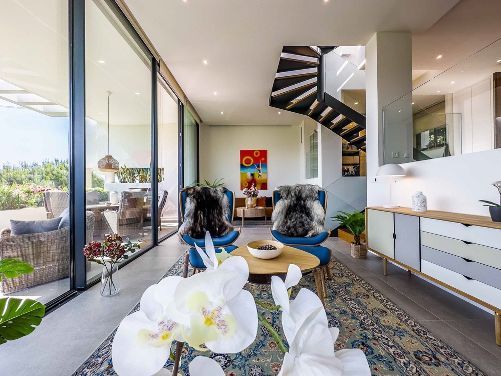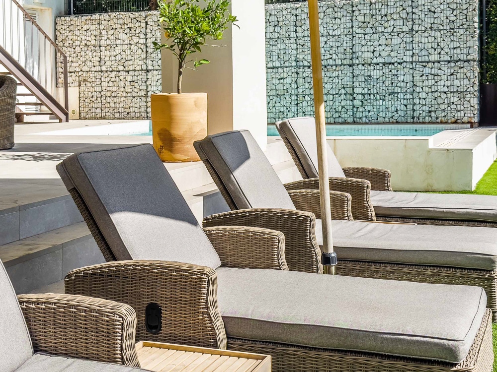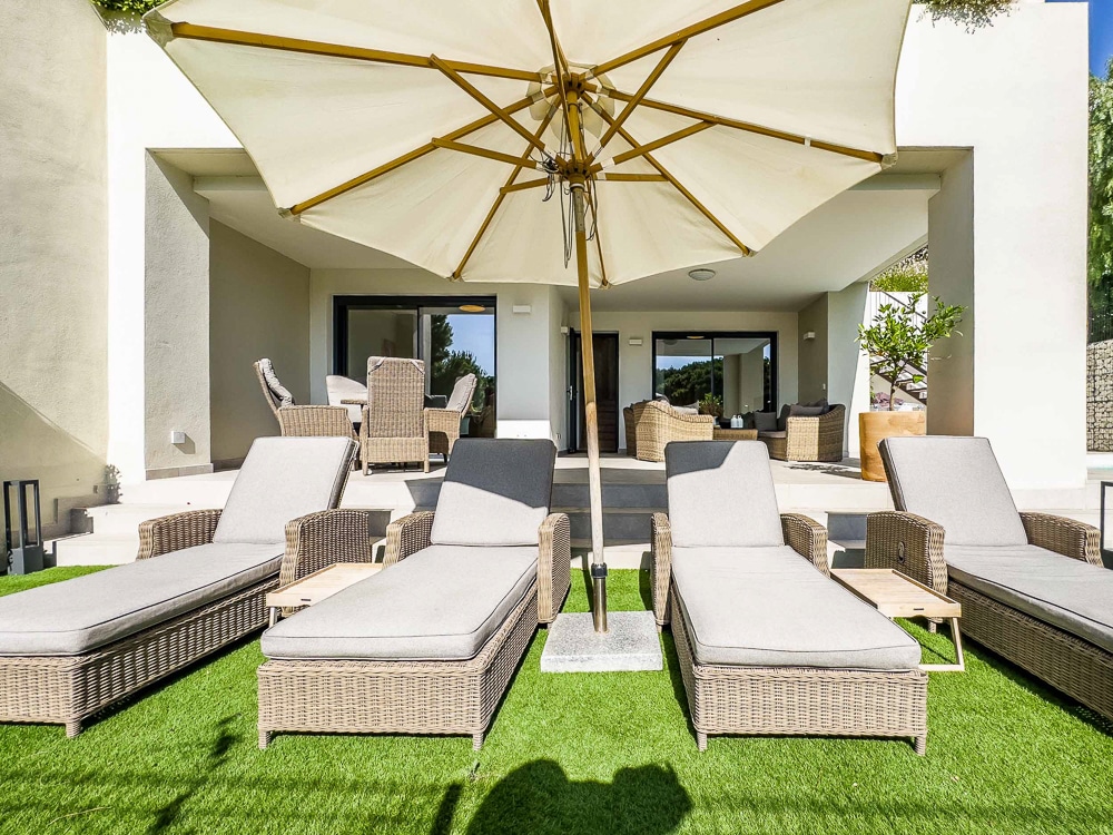 There are in total 3 spacious south west facing terraces in this beautiful house, in total 160 m2. The terraces and pool area are furnished with quality garden furniture with several comfortable lounges, dining tables, BBQ, parasols and sunbeds.